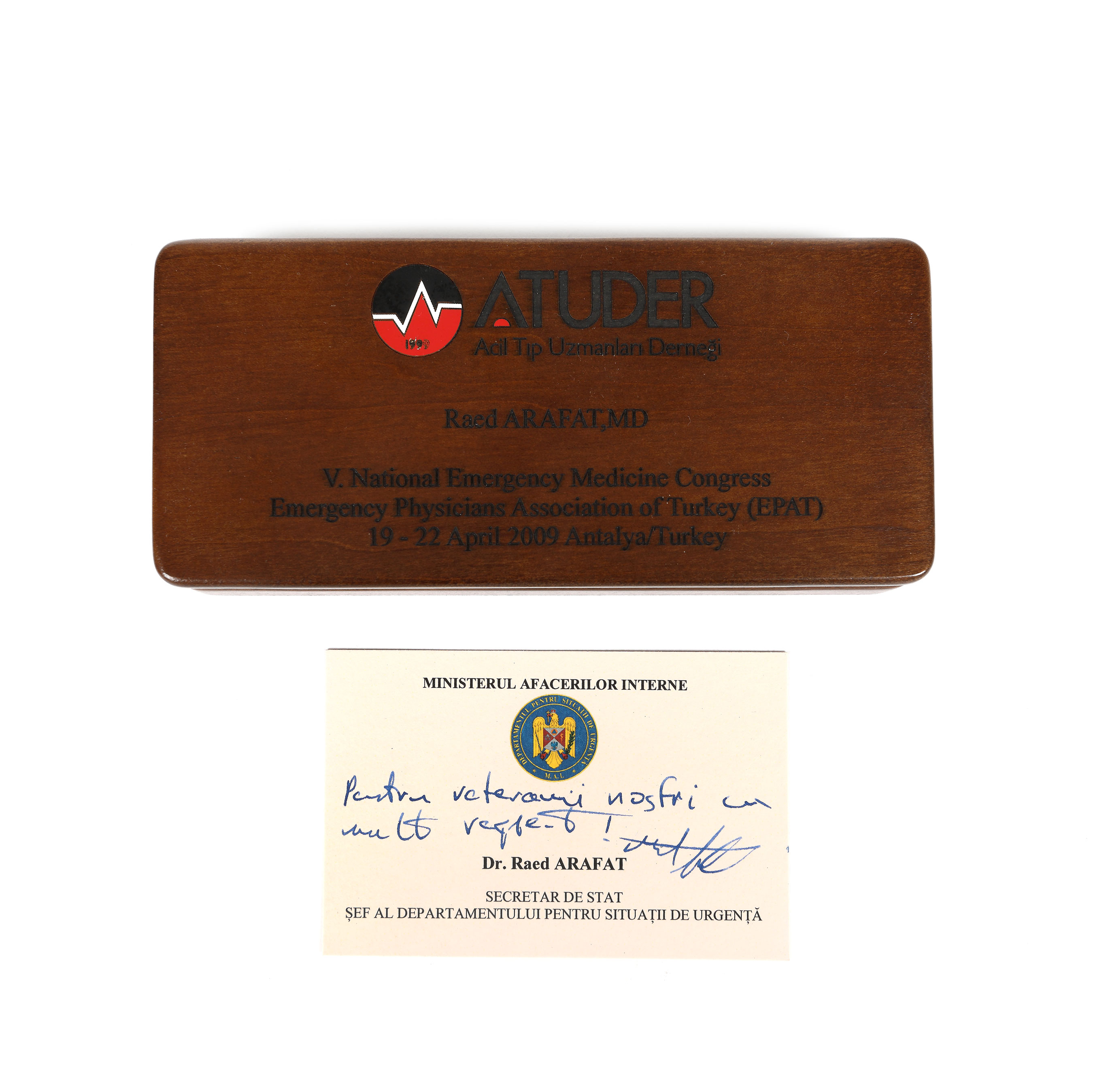 25. Lot format din stilou și două pixuri, într-un etui din lemn cu ceas, au aparținut fostului Ministru interimar al Sănătății, Raed Arafat, au fost primite în cadrul ”Celui de-al 5-lea congres dedicat medicinii de urgență”, Turcia, 19-22 aprilie 2009, însoțite de cartea de vizită a doctorului, cu dedicație