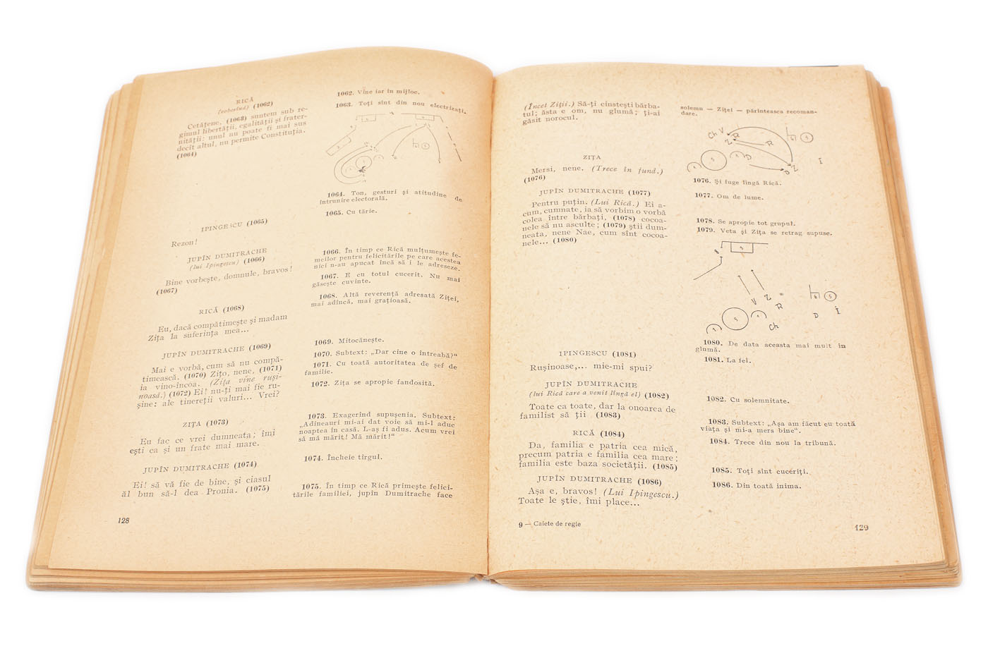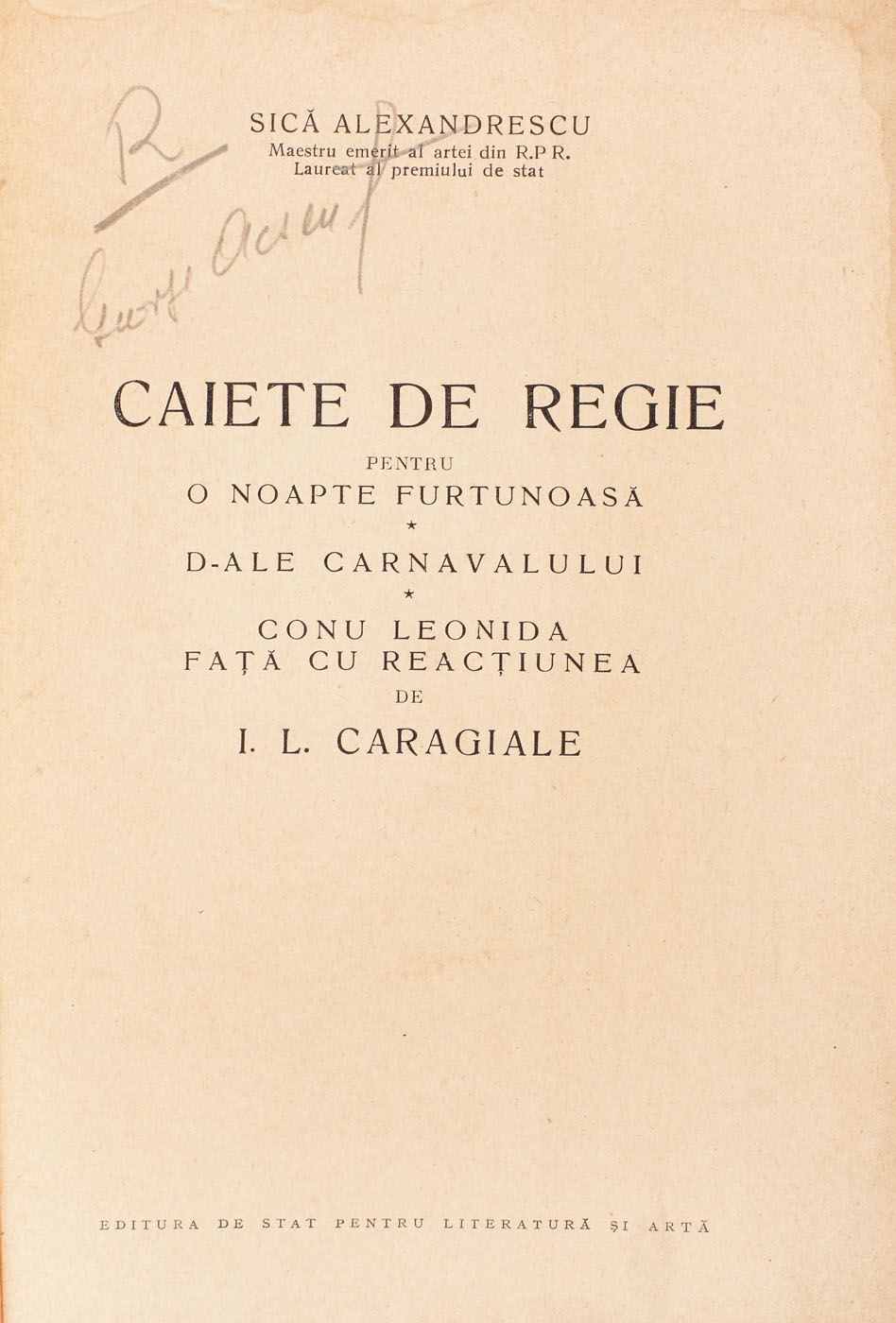 241. Caiete de regie pentru ”O noapte furtunoasă”, ”D'ale carnavalului", "Conu Leonida față cu reacțiunea” de I.L.Caragiale, scrise de Sică Alexandrescu, București, 1956, provin din colecția actorului Radu Beligan