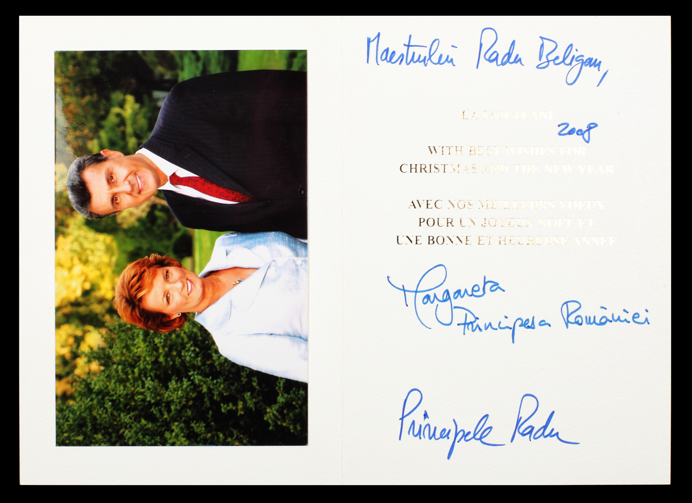 231. Două felicitări cu ocazia sărbătorilor de iarnă, 2008-2009, semnate de Principesa Margareta și Principele Radu, adresate lui Radu Beligan, provin din colecția actorului