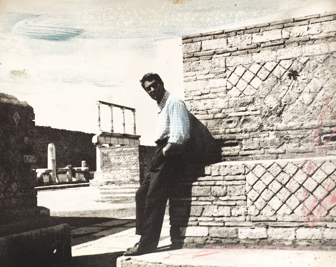 54. Fotografie, cu intervenții acuarelă, reprezentându-l pe Ion Pacea la Pompei, 1964