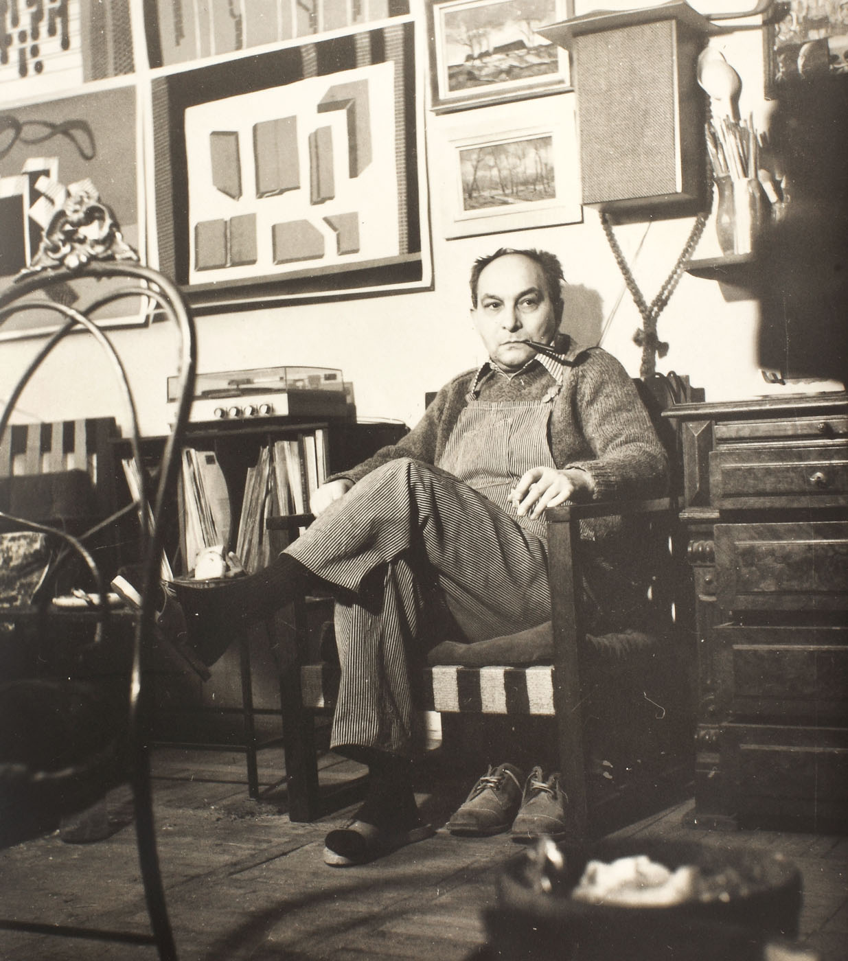 51. Fotografie ilustrându-l pe Spiru Chintilă în atelierul său, anii 1970, pe fundal varii stilistici experimentale