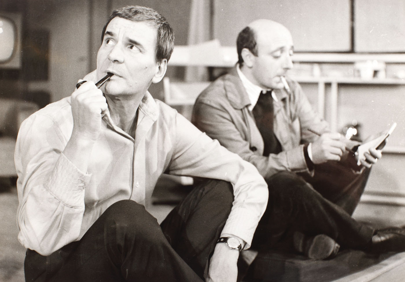 142. Fotografie reprezentându-i pe Radu Beligan şi Marin Moraru în timpul reprezentației piesei „Transplantarea inimii necunoscute" de Alexandru Mirodan, regia Moni Ghelerter, 1969, provine din colecția actorului Radu Beligan