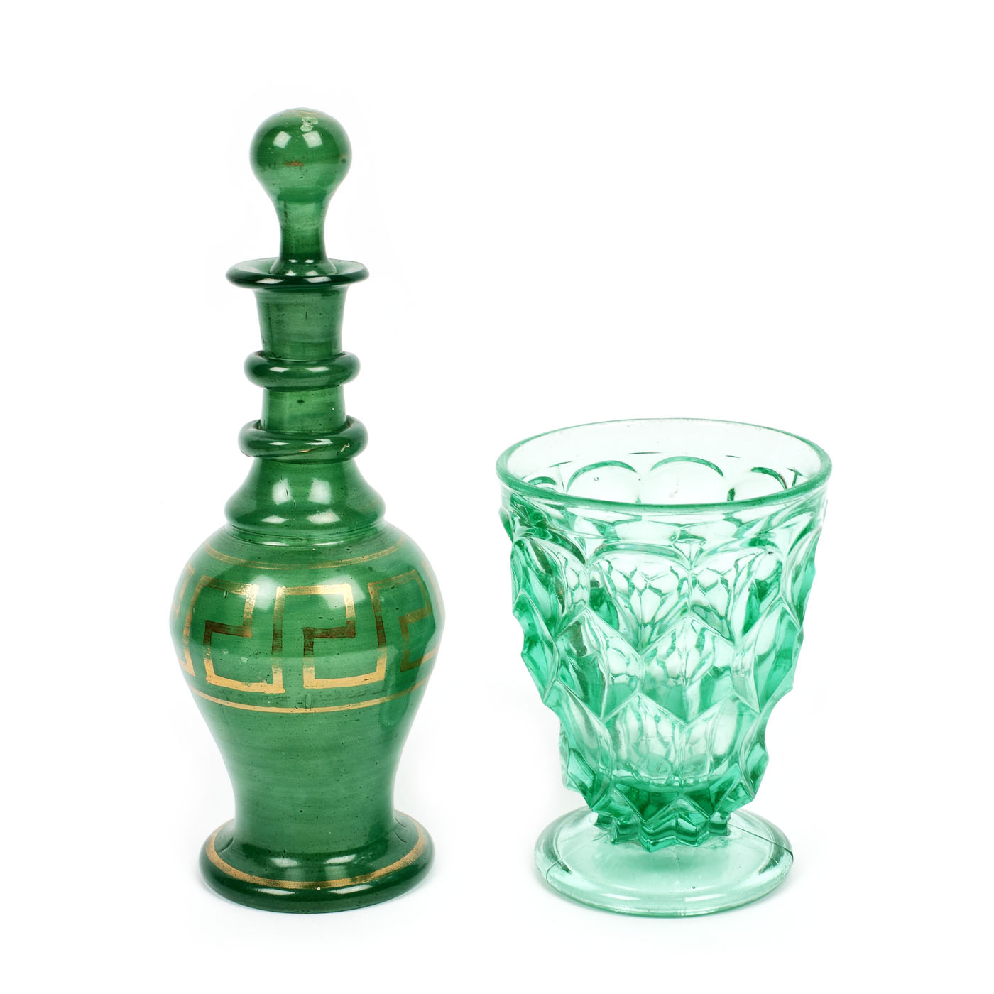 90. Lot de sticlă veche, un pahar și un recipient din sticlă pictată cu aur coloidal, provin din atelierul pictorului Honoriu Creţulescu