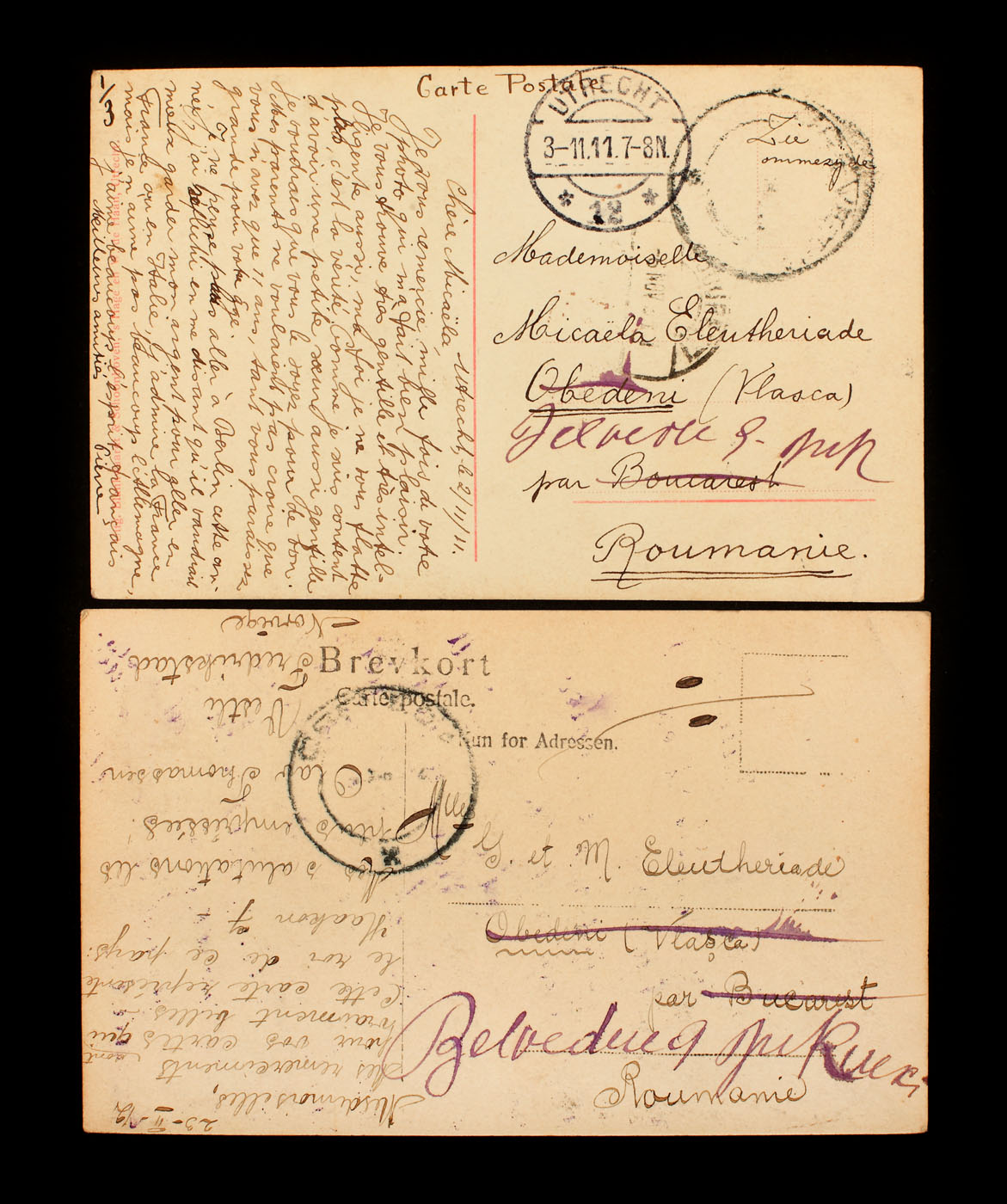 43. Lot format din două cărţi poştale trimise de Micaela Eleutheriade, sfârșitul anilor 1920