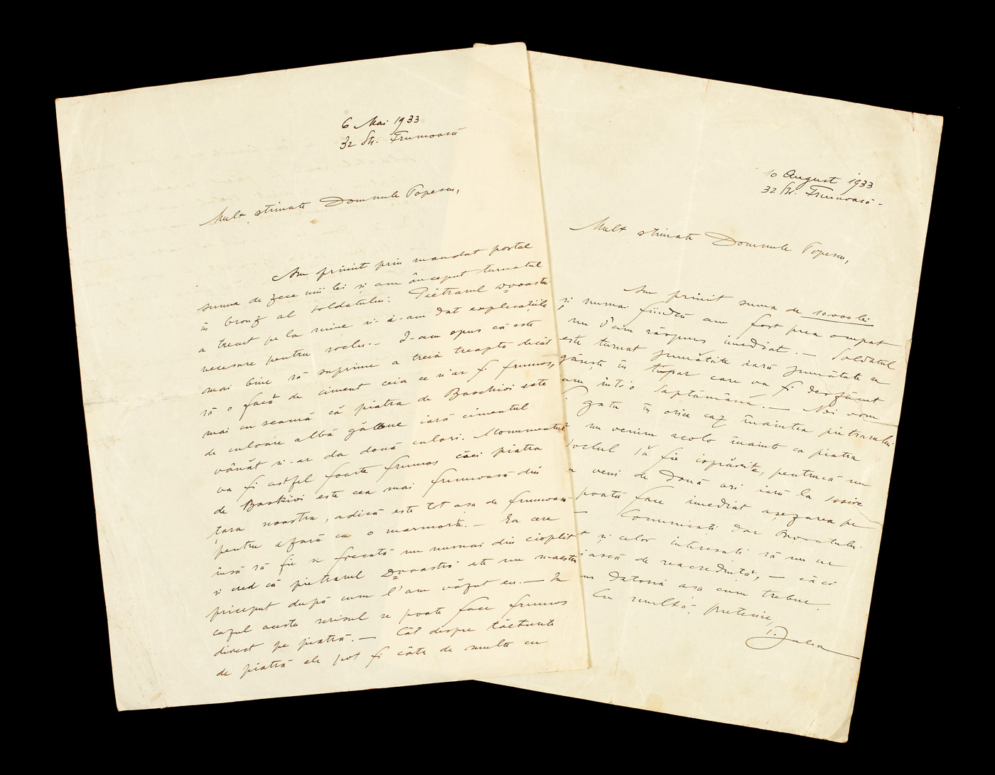 41. Lot format din două scrisori ale lui Ion Jalea cu privire la stadiul Monumentului Eroilor din Sărata-Monteoru (Buzău), 6 mai 1933 respectiv 10 august 1933 (2 file)
