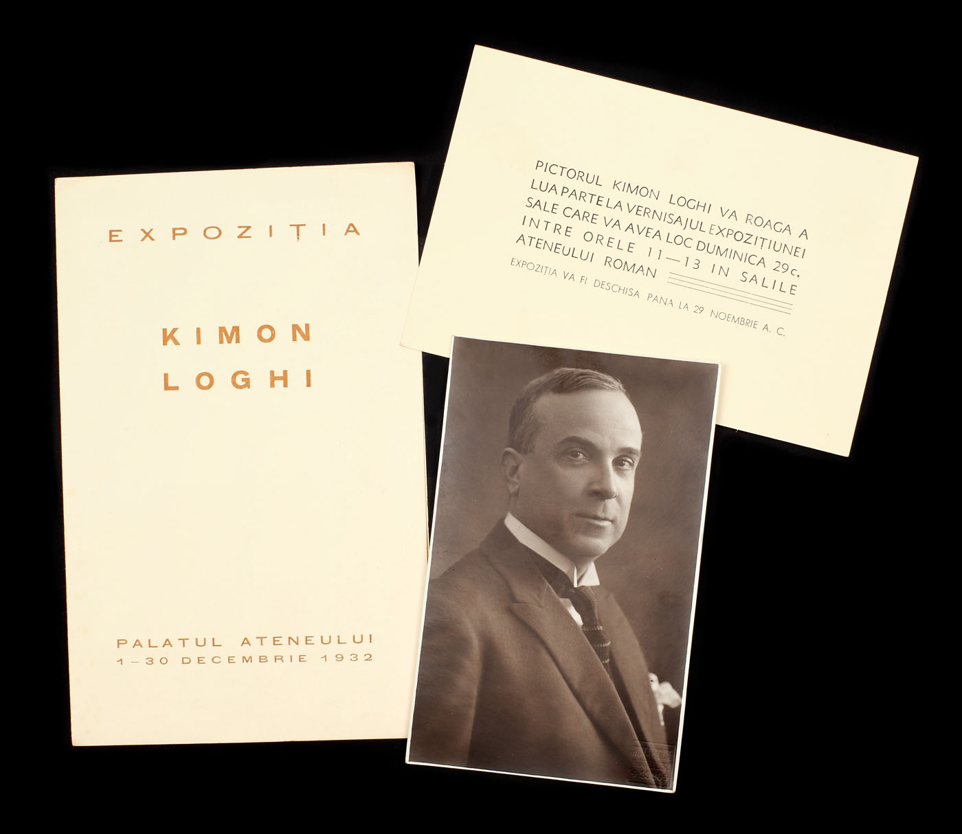 44. Lot format dintr-o fotografie a lui Kimon Loghi dedicată actriței Mariei Filotti, o invitație la vernisajul expoziţiei personale și pliantul expoziției sale de la Palatul Ateneului, 1932
