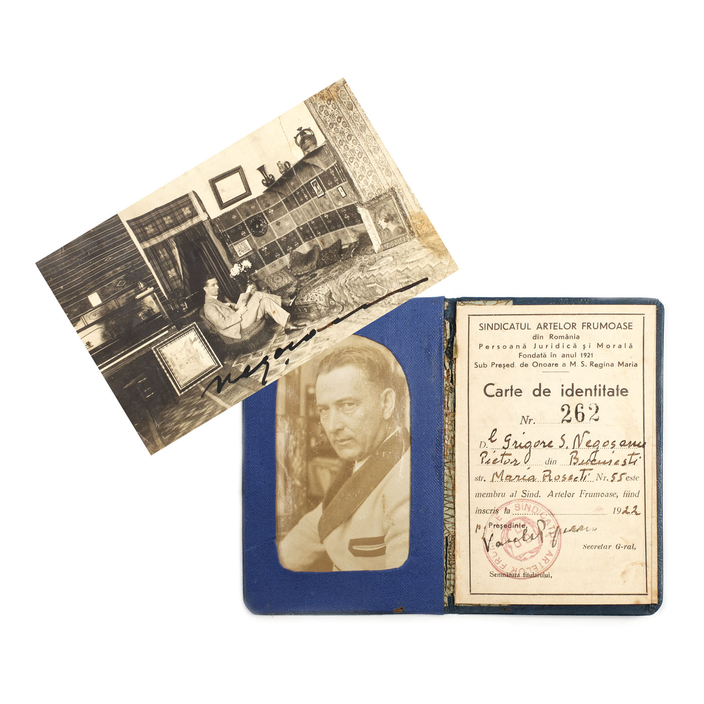 45. Lot Grigore Negoșanu, format din carnetul său de membru al Sindicatului Artelor Frumoase și o fotografie reprezentându-l în atelier, semnată olograf, 1918