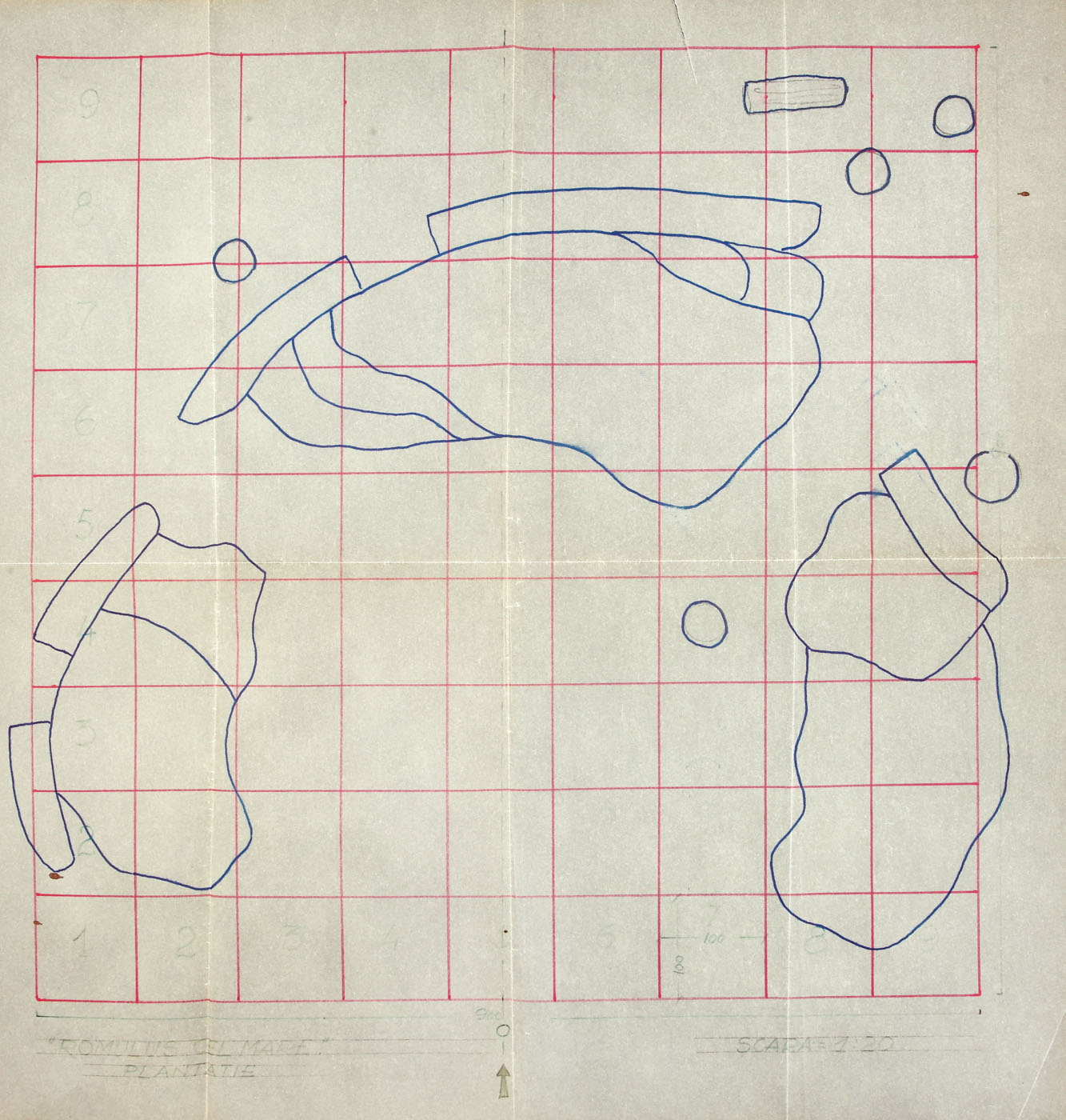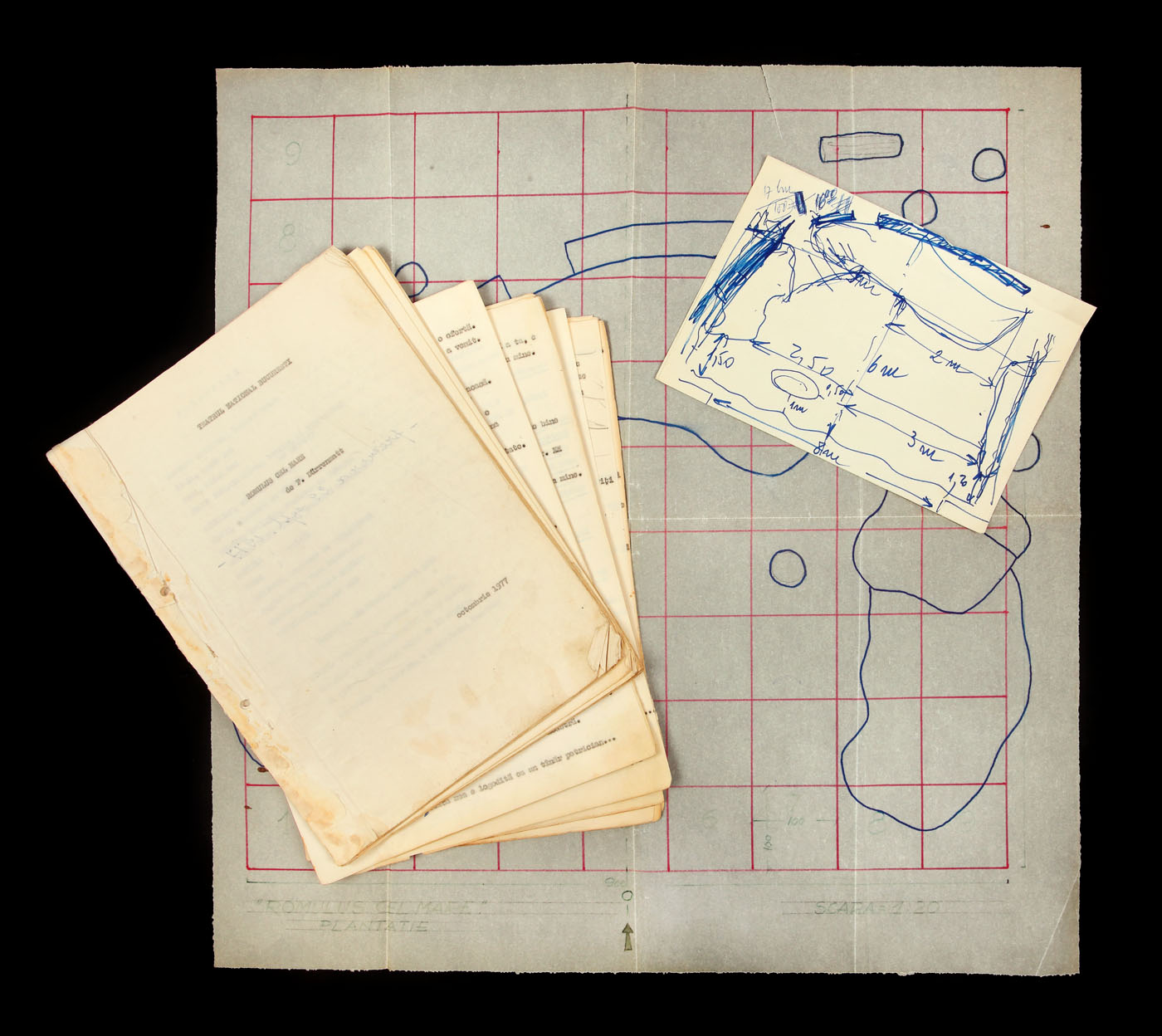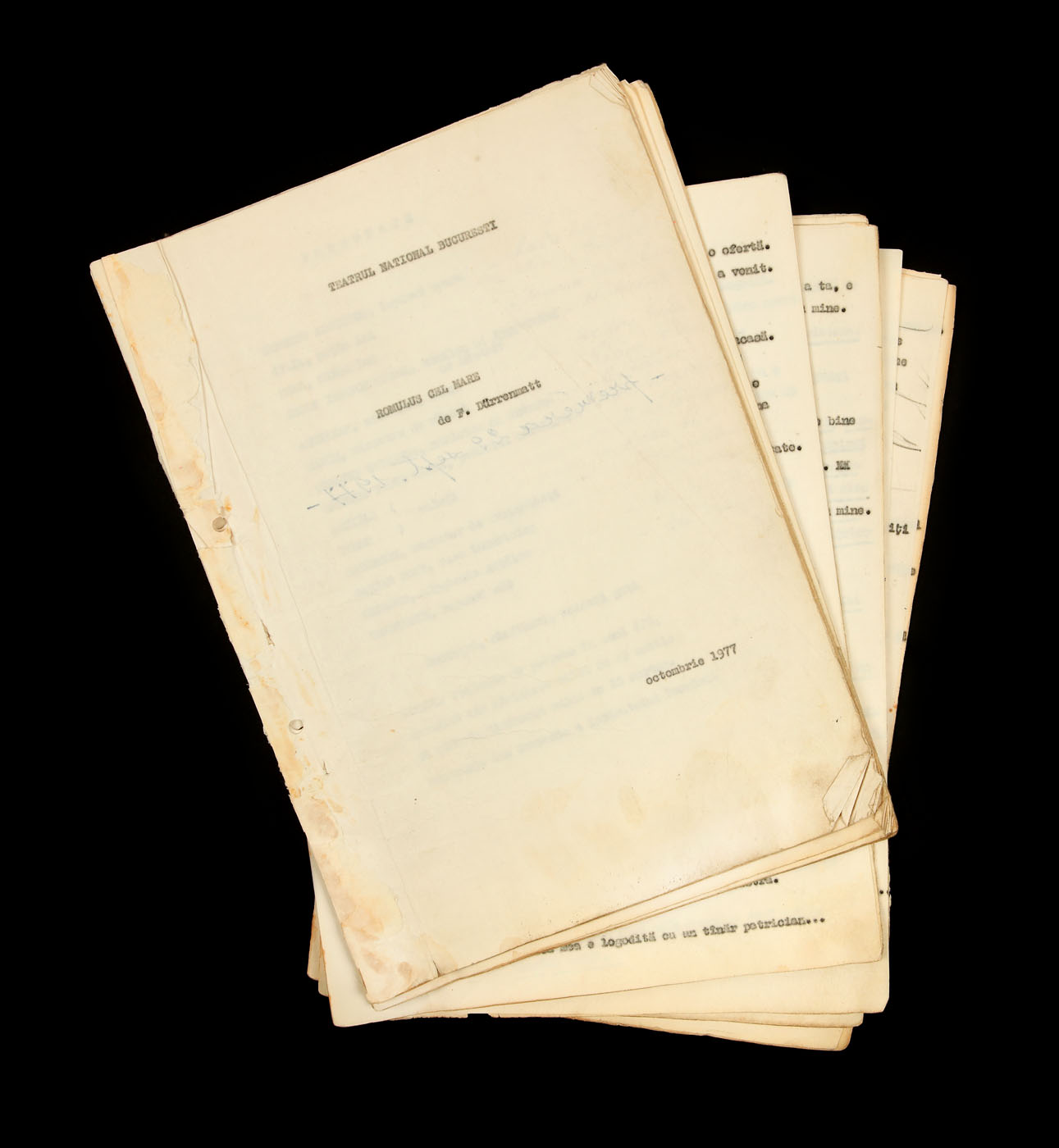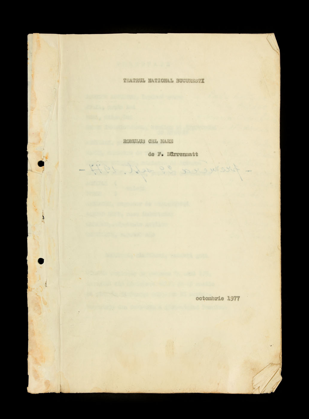 244. Manuscris al piesei "Romulus cel Mare", de F. Durrenmatt, însoţit de două schiţe de aranjare a decorului în scenă, octombrie 1977