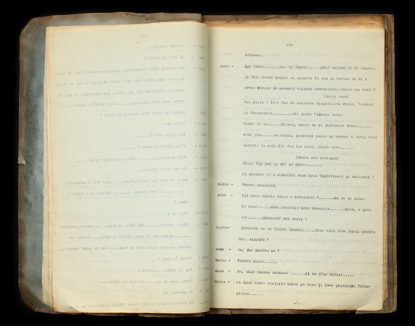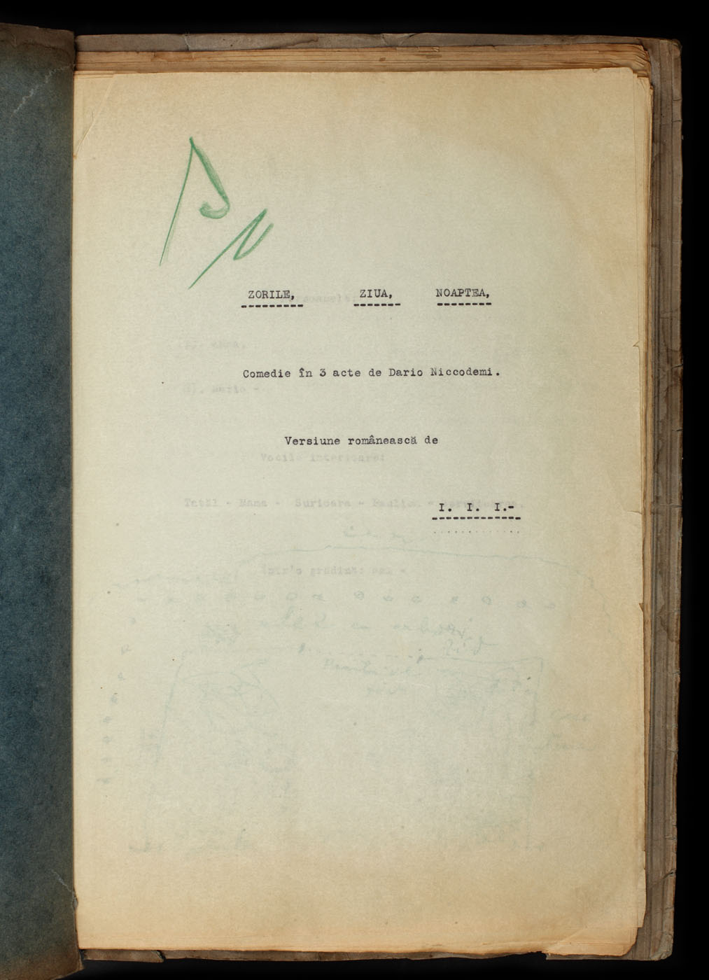 249. Manuscris al piesei "Zorile, ziua, noaptea (Duelul)", comedie în trei acte de Dario Niccodemi (26 file), semnat olograf de Ion Iancovescu, provine din colecția actorului Radu Beligan