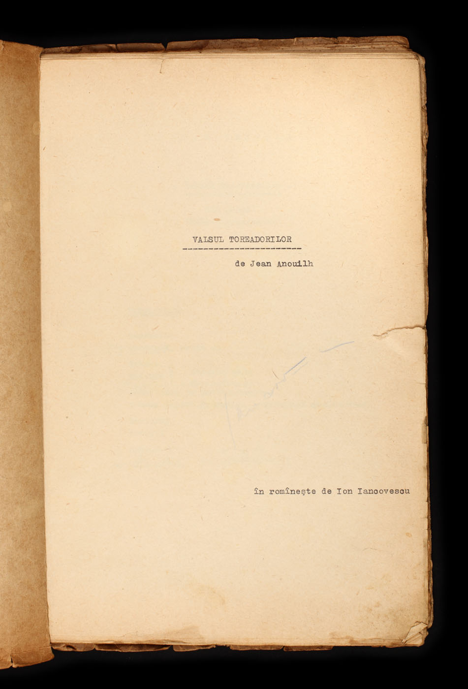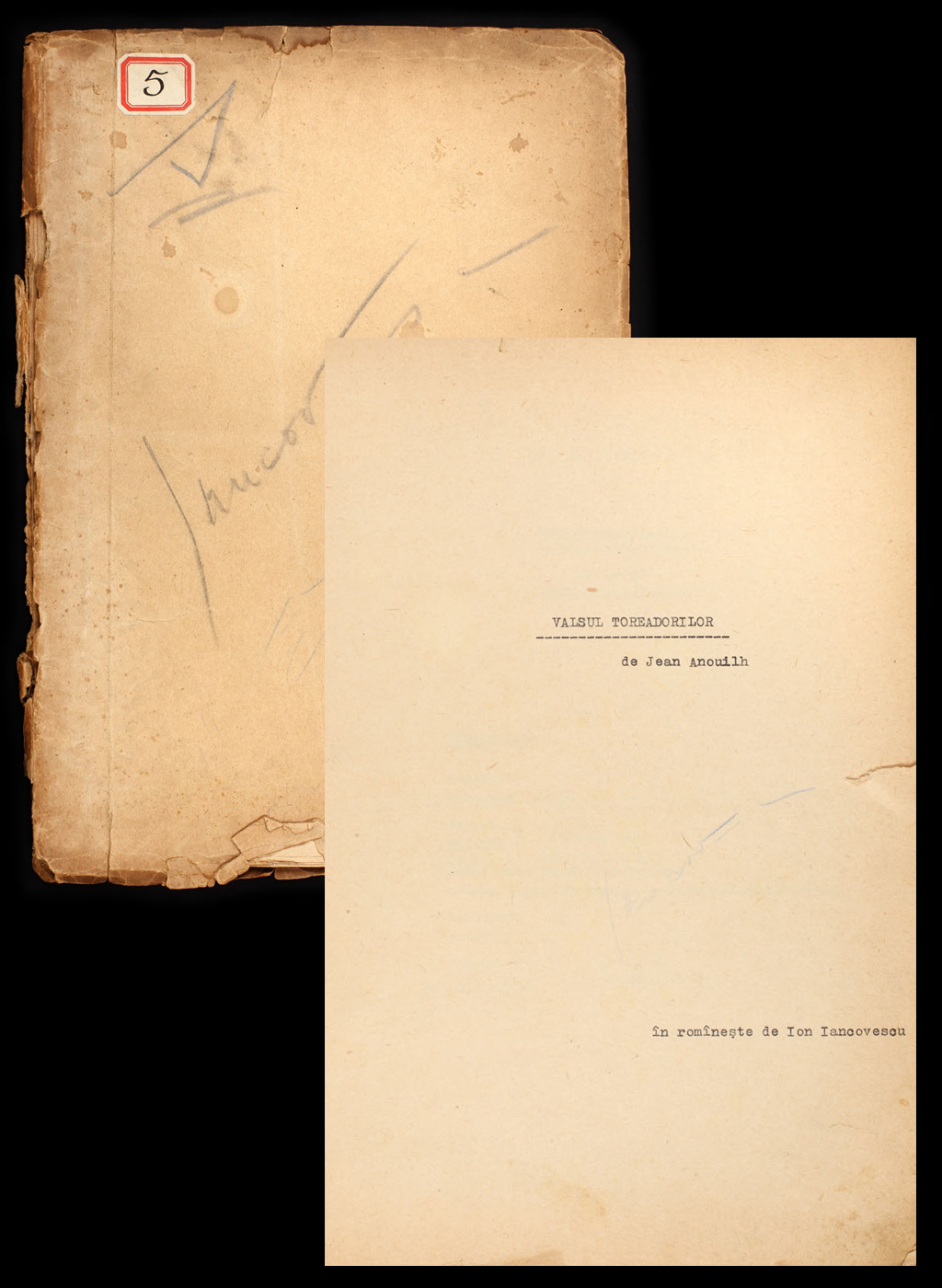 251. Manuscrisul piesei "Valsul toreadorilor" de Jean Anouilh (101 file), semnat olograf de Ion Iancovescu, provine din colecția actorului Radu Beligan