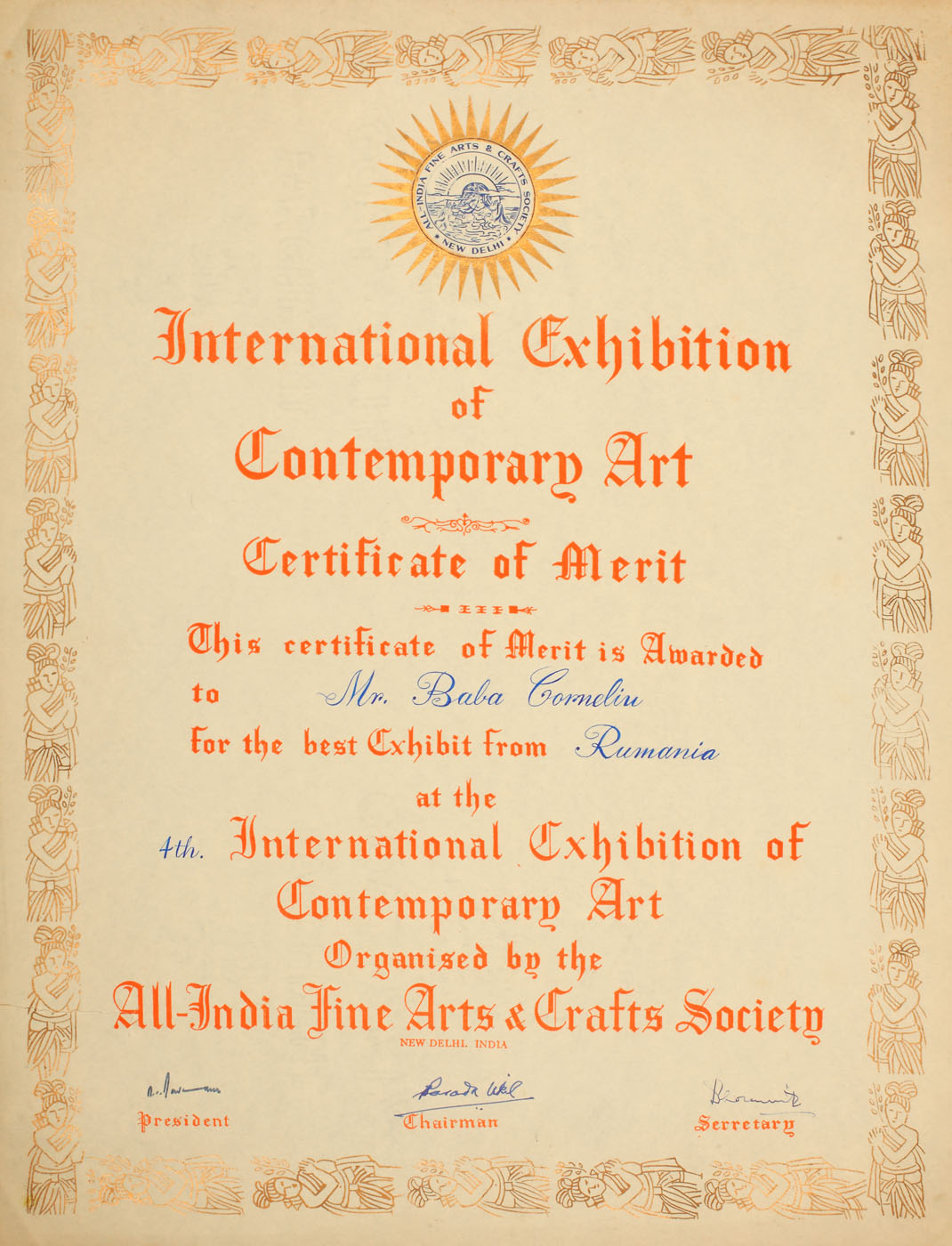 50. Premiu pentru cea mai bună expoziție, acordat lui Corneliu Baba în cadrul Expoziției Internaționale de Artă Contemporană (a 4-a ediție), organizată de "All-India Fine Arts & Crafts Society", la New Dehli, India, anii 1960