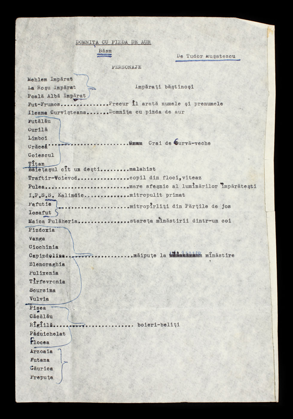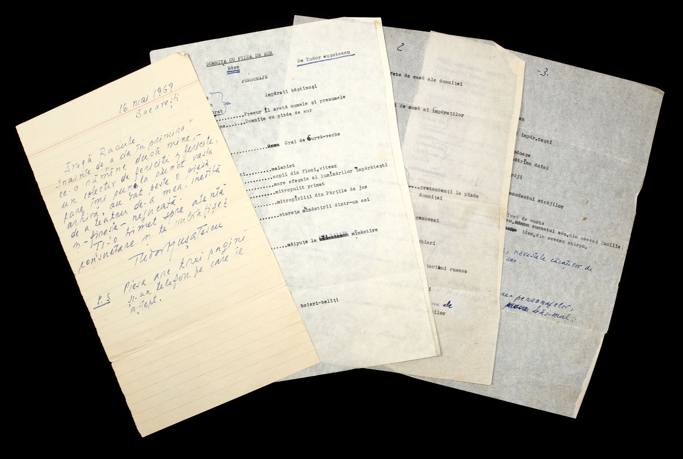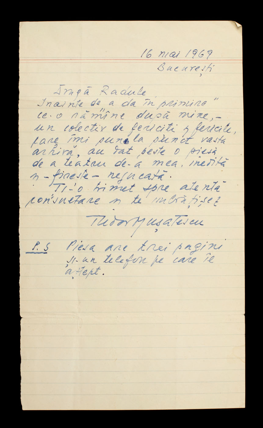 242. Scrisoare trimisă de Tudor Mușatescu lui Radu Beligan, însoțită de un manuscris al unei piese-pamflet erotice ("Domnița cu p... de aur") a lui Tudor Mușatescu, 16 mai 1969 (3 file), provine din colecția actorului