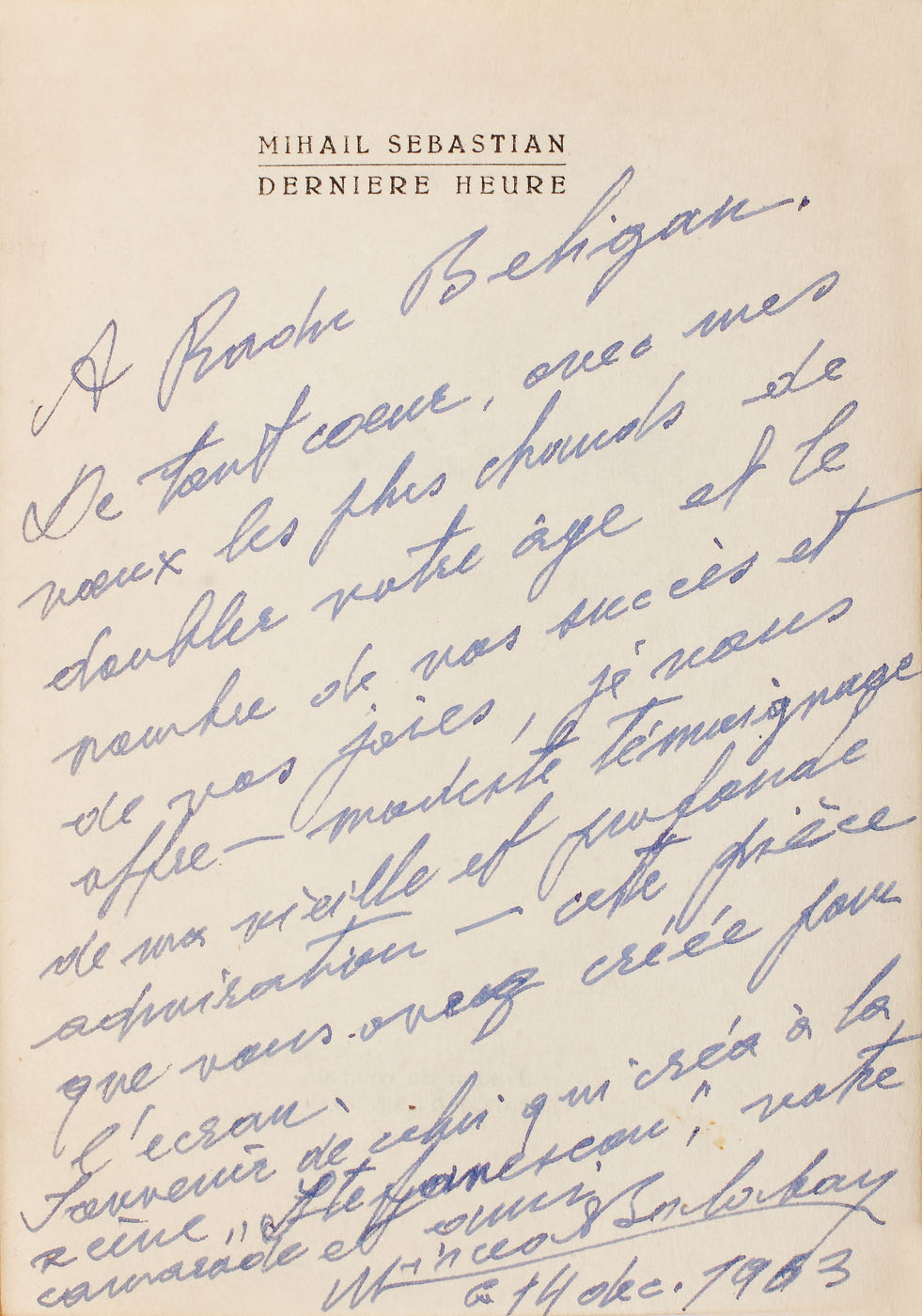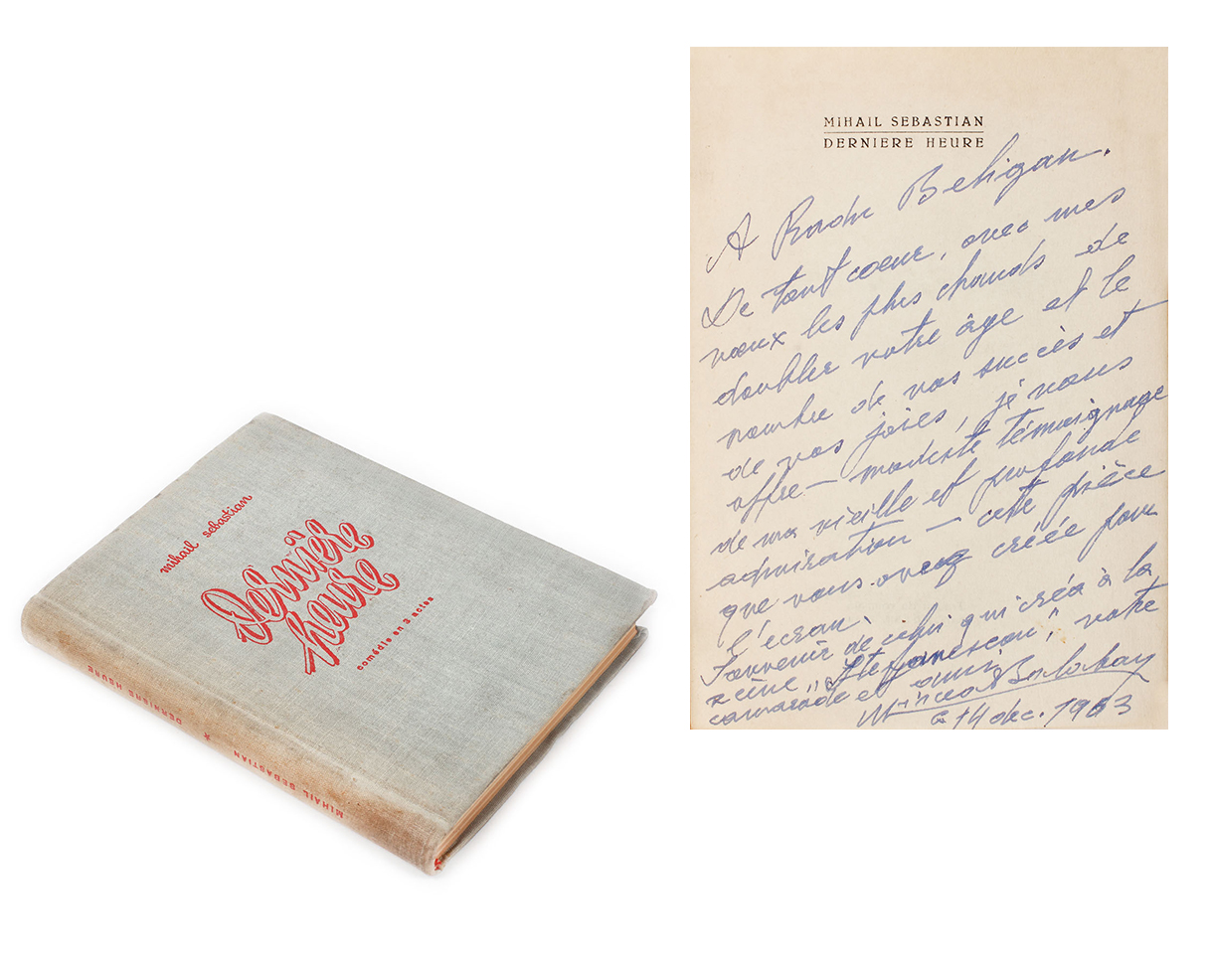 173. ”Ultima oră”, de Mihail Sebastian, franceză, București, 1954, cu dedicația actorului Mircea Balaban, provine din colecția actorului Radu Beligan