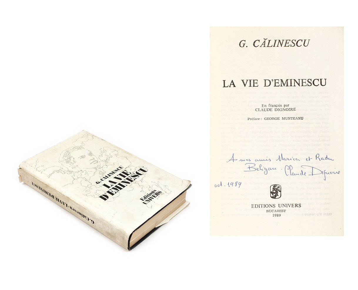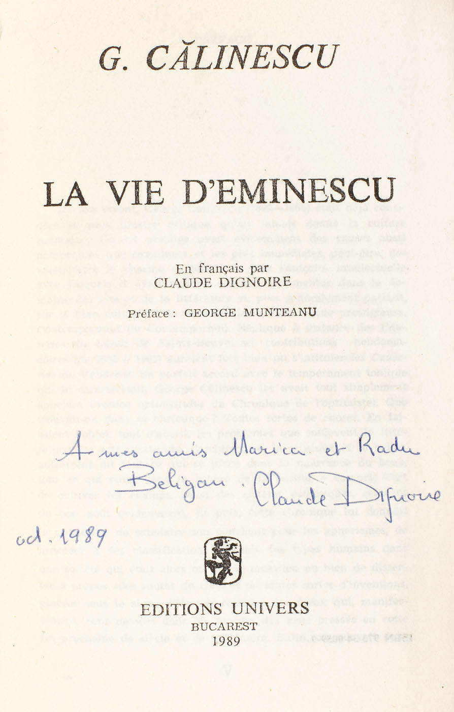 165. "Viața lui Mihai Eminescu", de George Călinescu, franceză, București, 1989, cu dedicația traducătorului Claude Dignoire către Radu Beligan, provine din colecția actorului