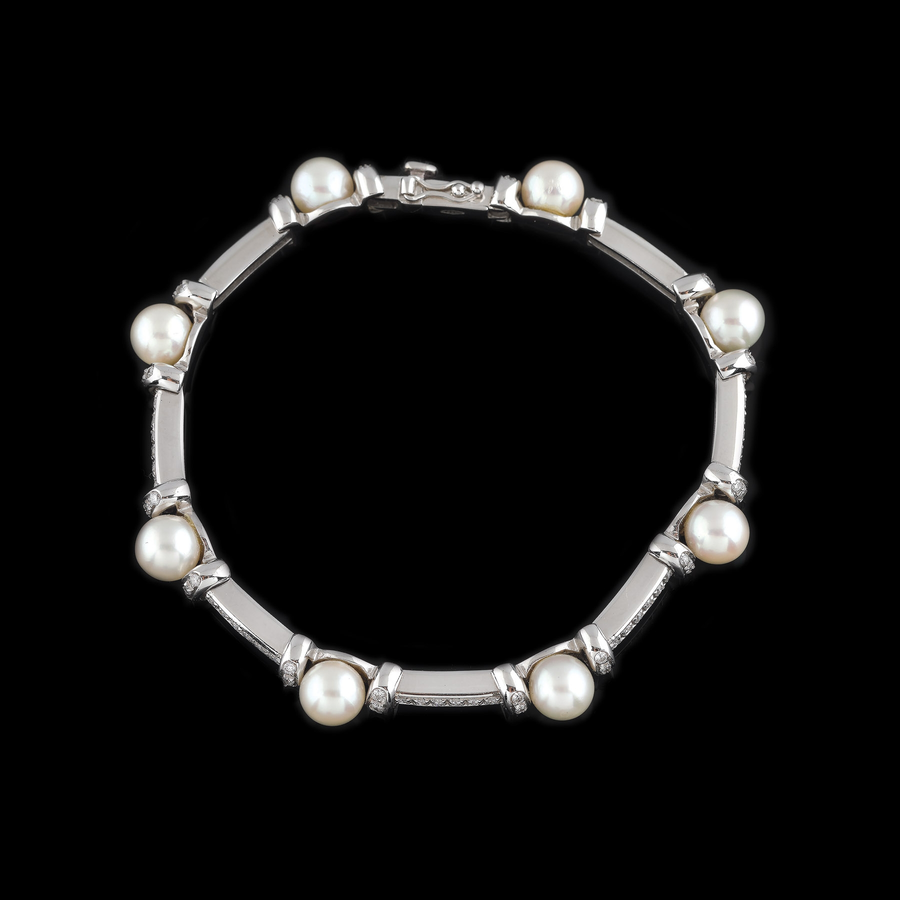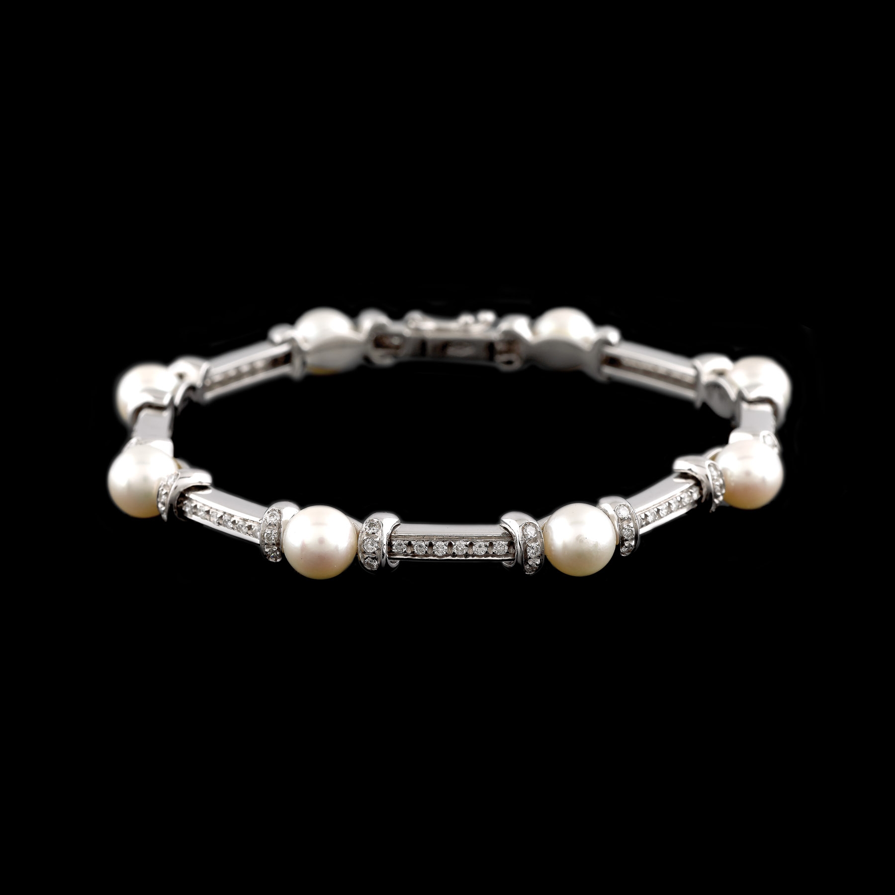 72. Elegantă brățară din aur alb, decorată cu diamante și perle
