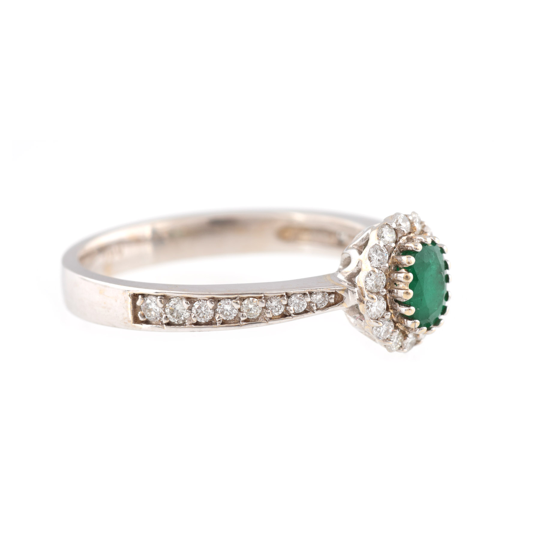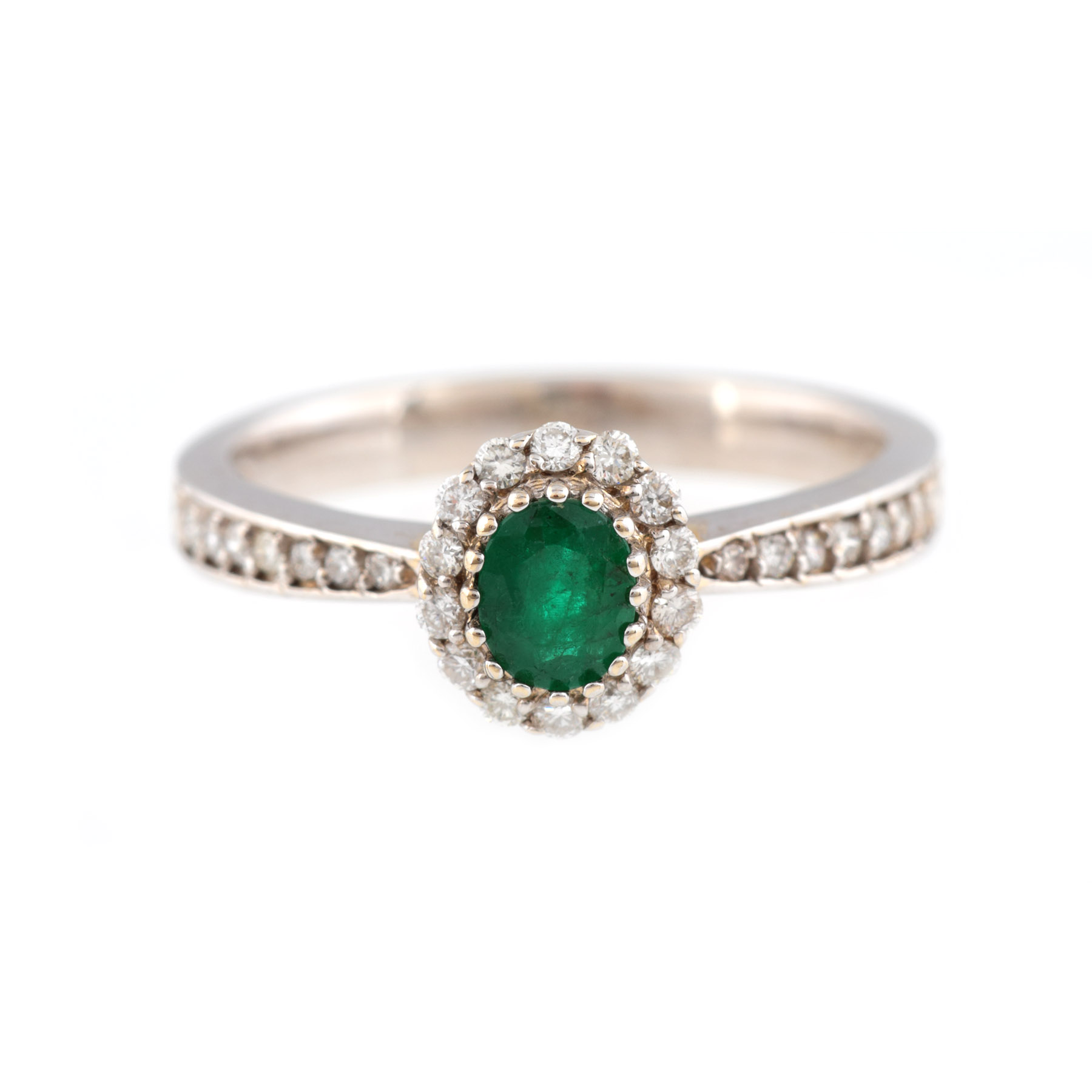 1 smarald oval fațetat, culoare verde, claritate moderately included, cca. 0,3 ct și 30 diamante rotunde briliant, culoare I-J, claritate VS, cca. 0,38 ct.