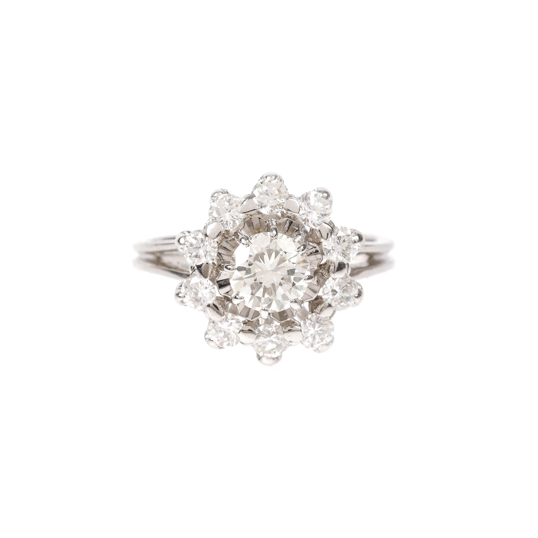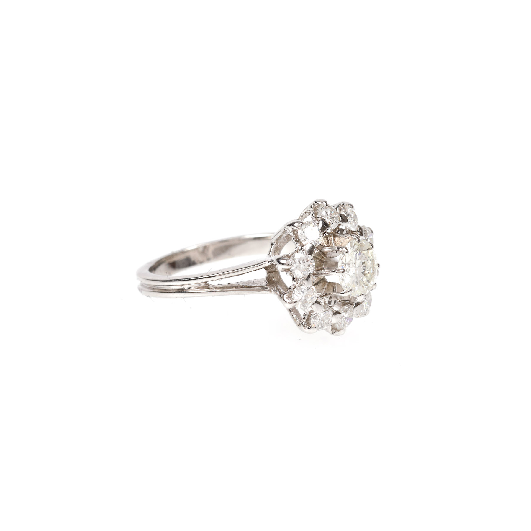 1 diamant rotund briliant, culoare J, claritate VVS2, cca. 0,57 ct. și 10 diamante rotunde briliant, culoare I-J, claritate VS, cca. 0,55 ct.