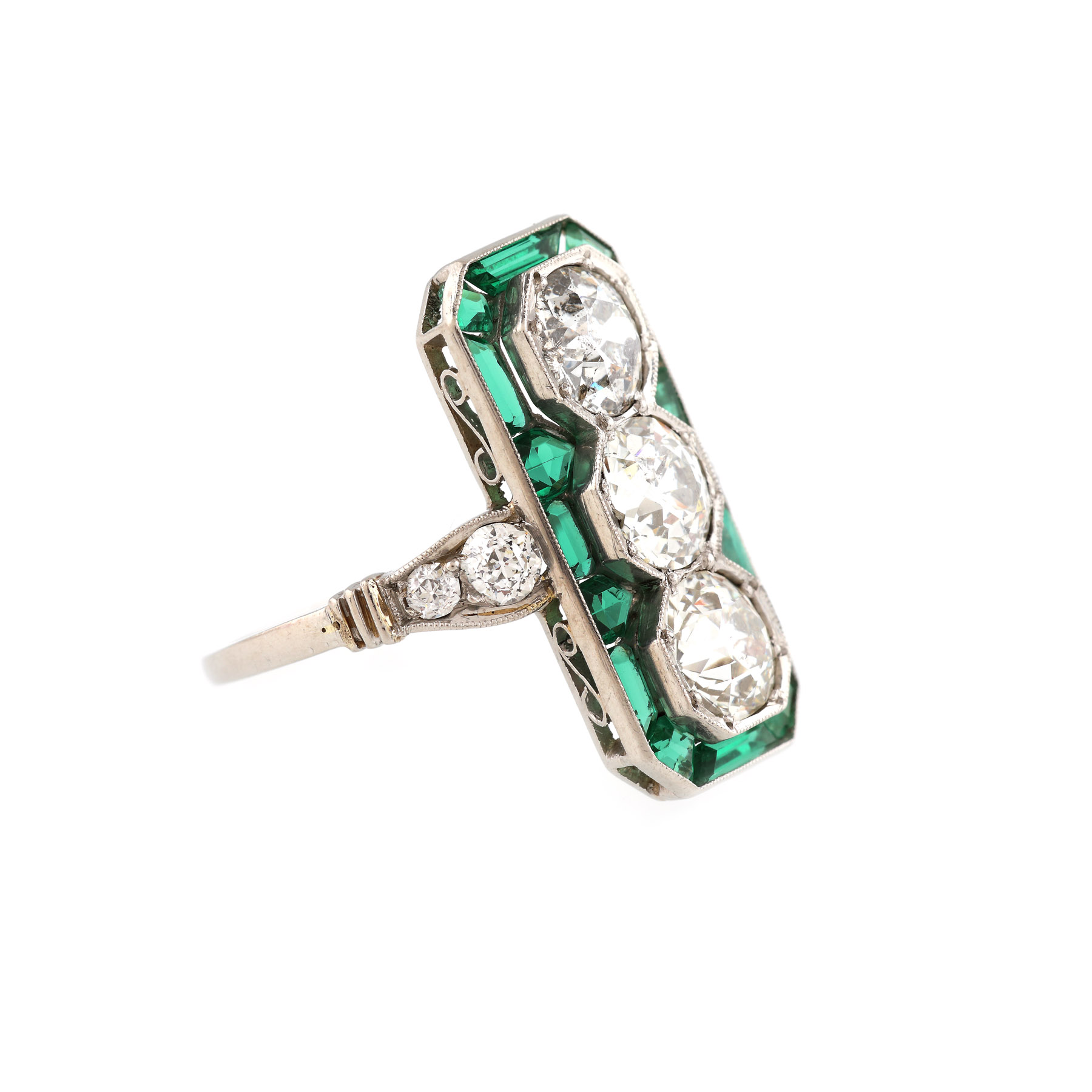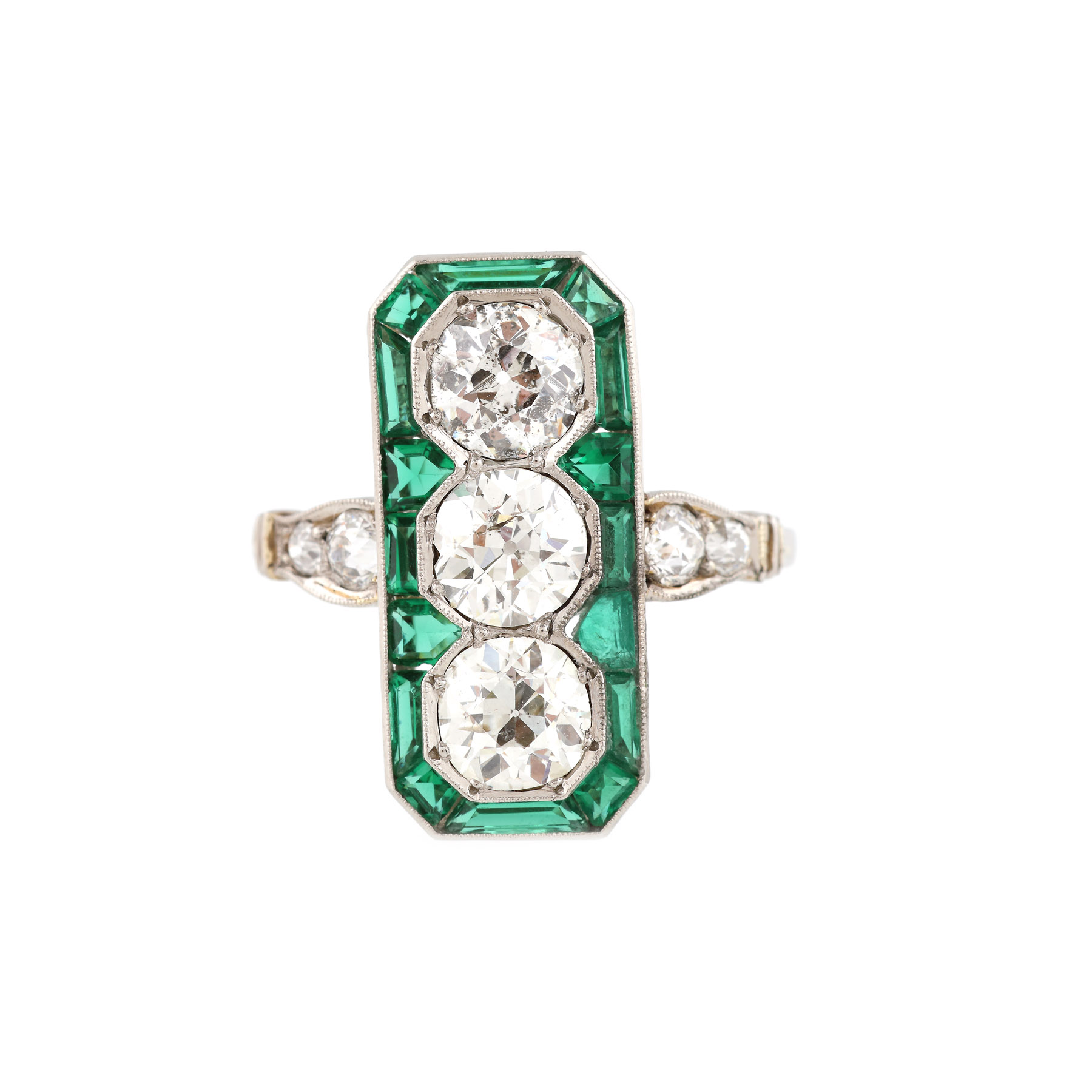 3 diamante european cut, culoare H-I, claritate I1, cca. 2,4 ct. și 4 diamante european cut, culoare G-H, claritate VS-SI, cca. 0,34 ct.; 1 smarald; pietre ornamentale verzi