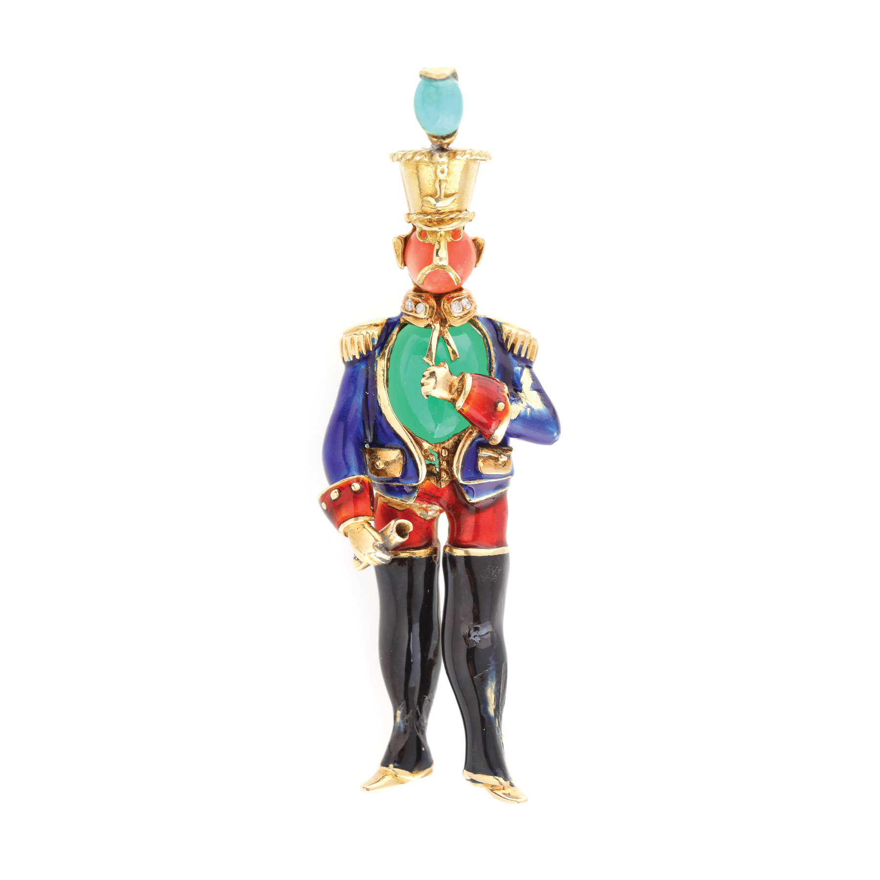 64. "The Nutcracker Doll " - broșă din aur, în forma unui soldățel, decorată cu email, turcoaz, coral, calcedonie și diamante