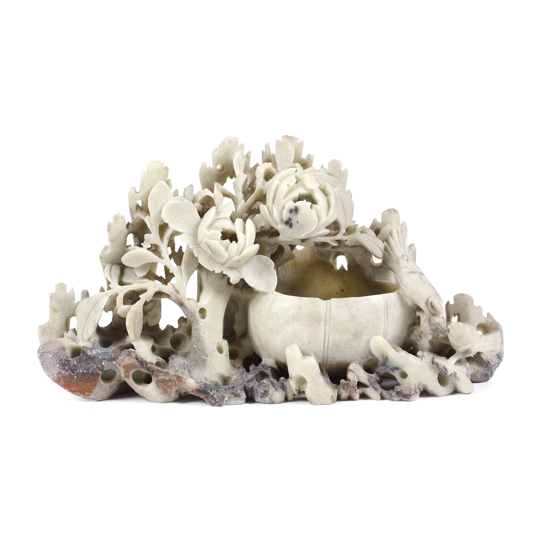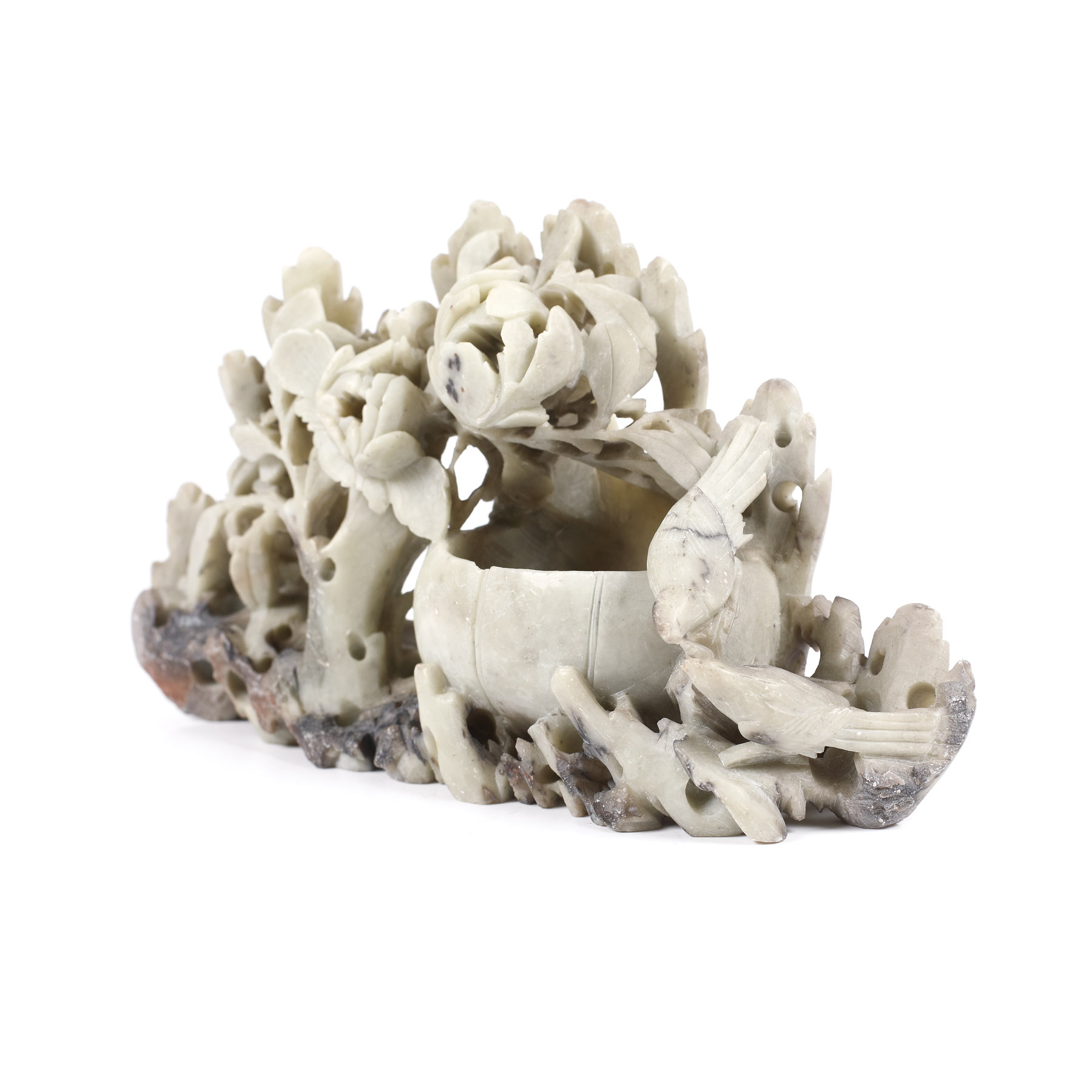 138. Brûle-parfum din steatit, decorat cu bujori și păsări exotice, provine din colecţia Lucrezia și Ion Pacea [cca. 1970]