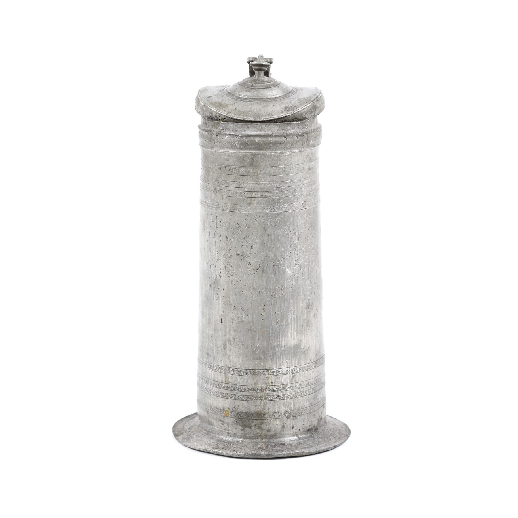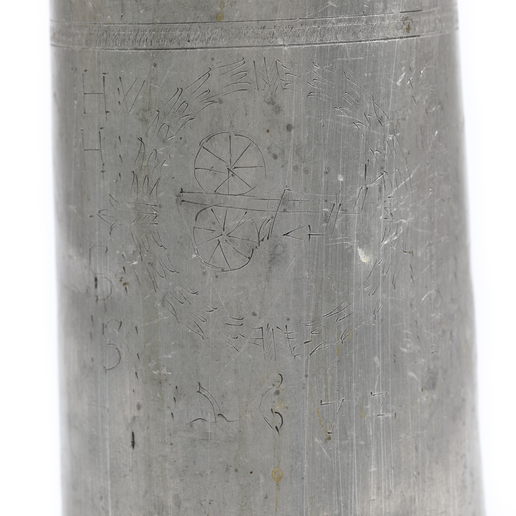 Carafă cilindrică, gravată cu emblema breslei rotarilor/caretarilor, înscrisă într-o coroană vegetală, flancată de inițialele "HH/SS" și "SS/ FP" (probabil ale donatorilor cănii). Decor cu brâuri incizate și capac deteriorat.