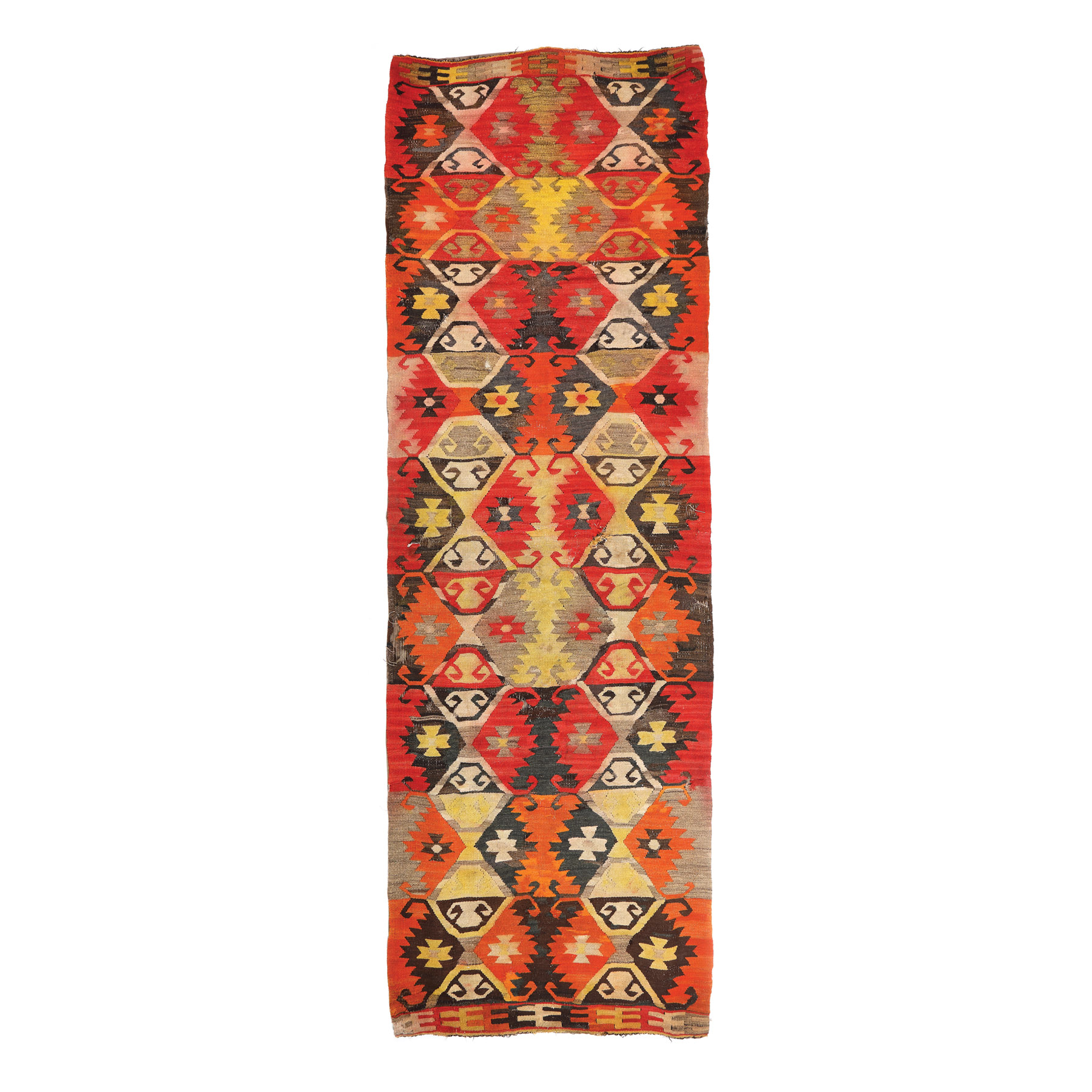 83. Covor din lână, lucrat în manufactura sârbească din centrul Pirot, decorat cu elemente geometrice, începutul sec. XX, provine din colecţia Lucrezia și Ion Pacea
