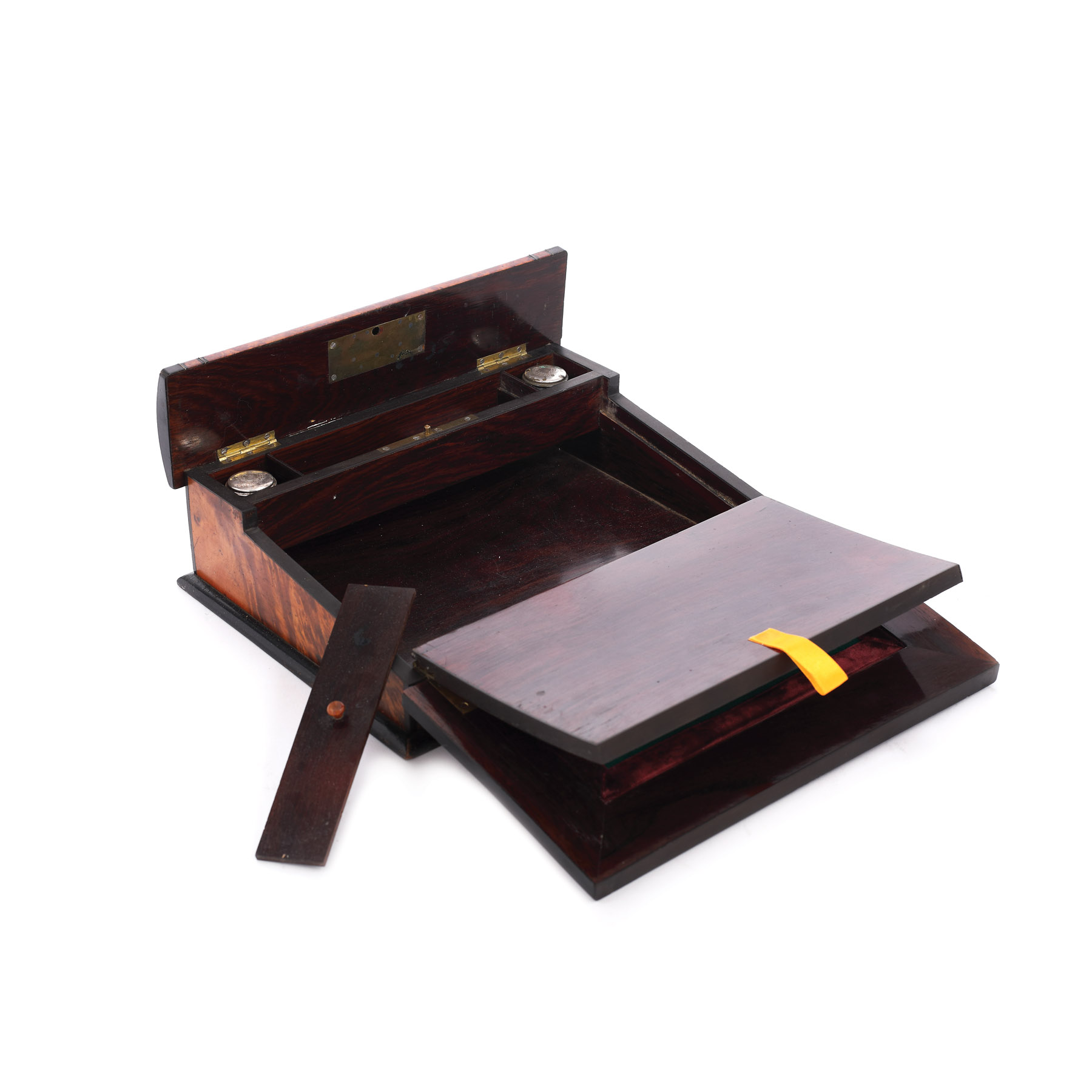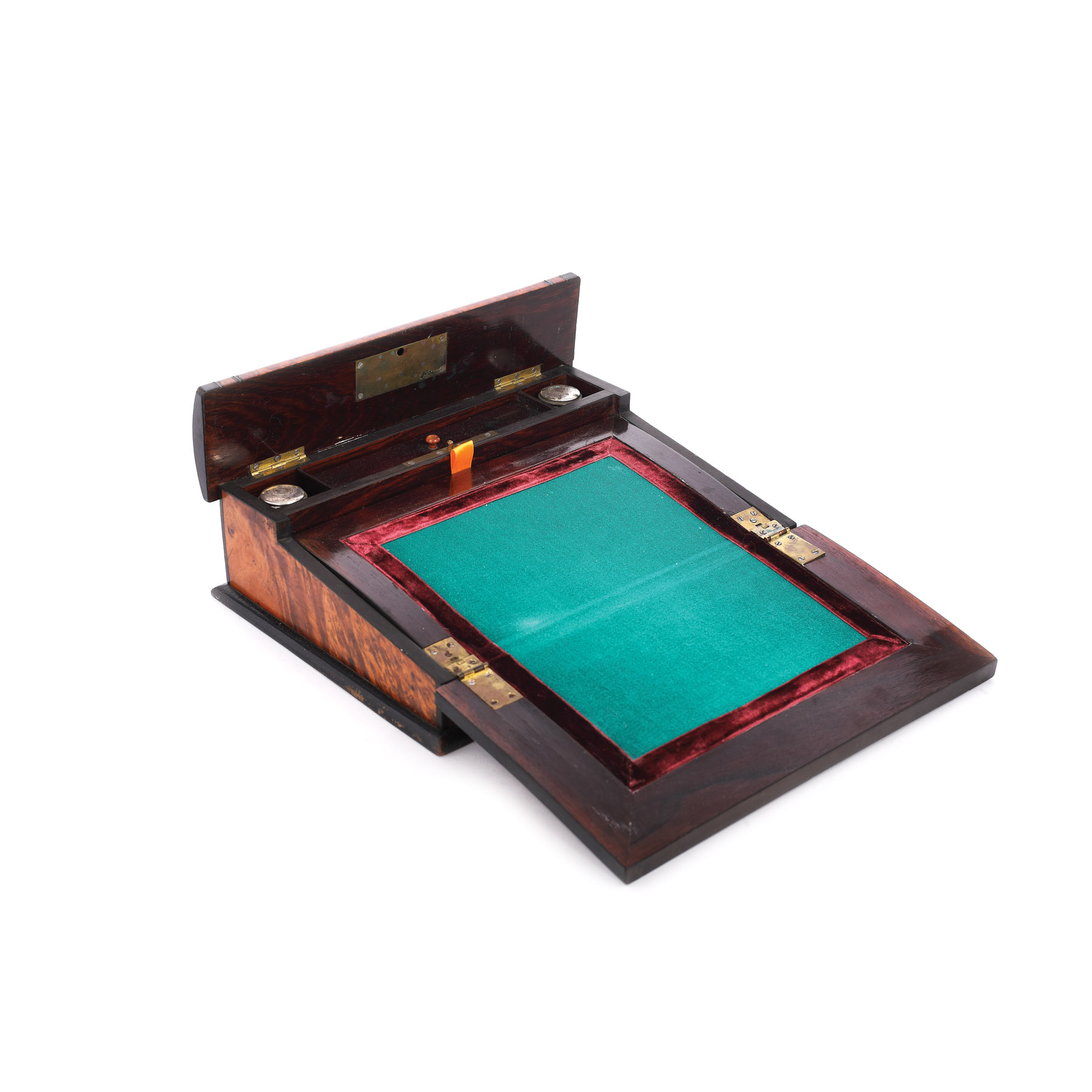 122. Écritoire Napoleon III, pentru călătorie, cu medalion central monogramat și intarsiat cu sidef și alamă, sfârșitul sec. XIX, provine din colecţia Lucrezia și Ion Pacea