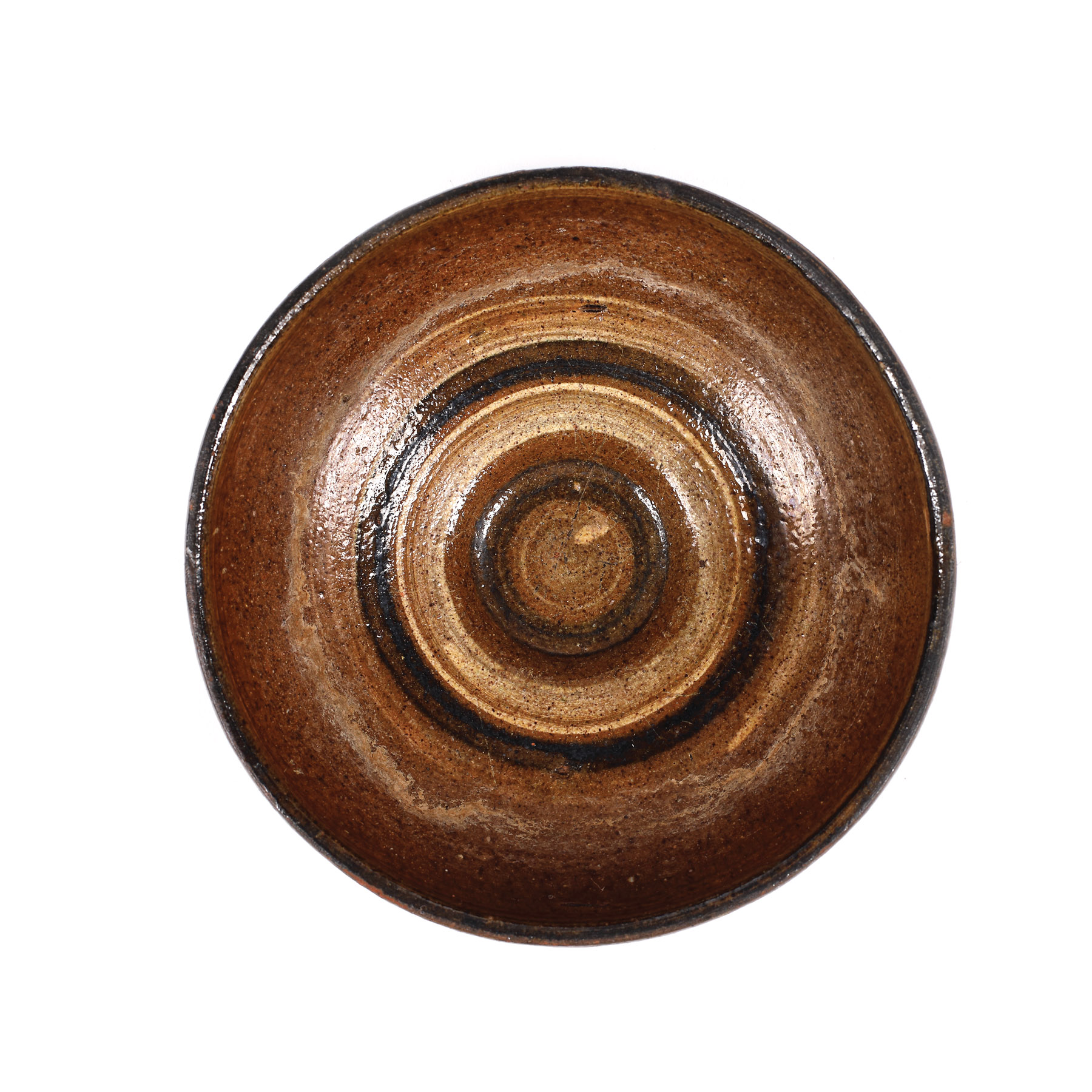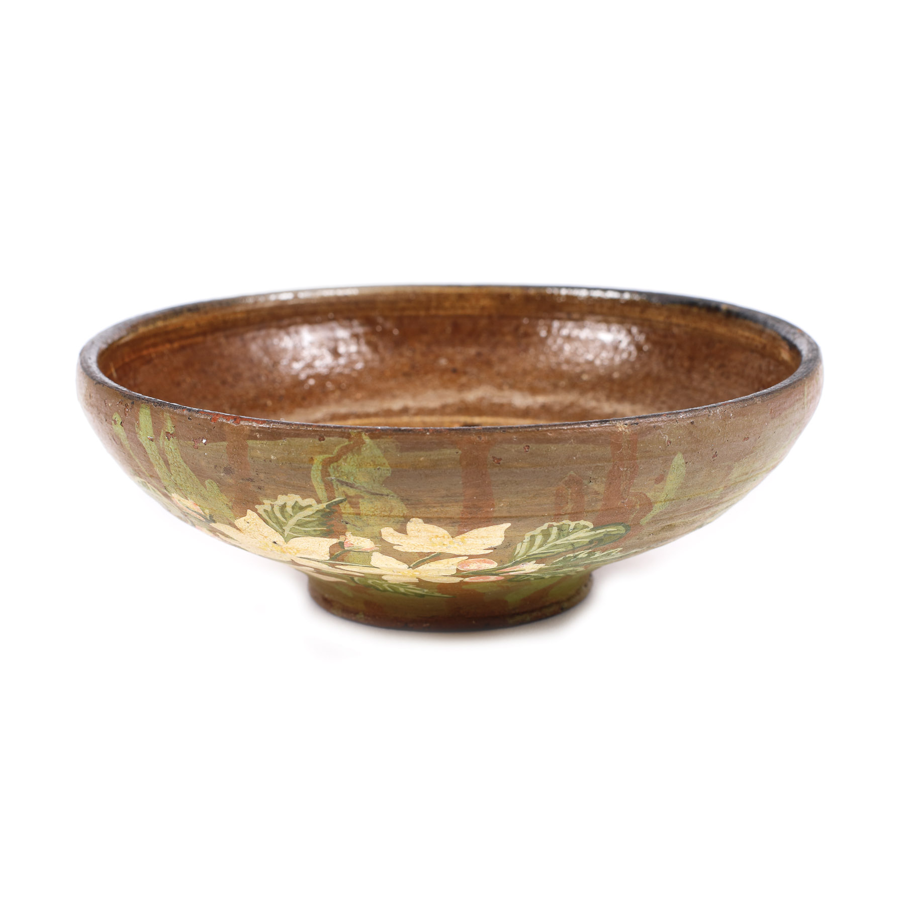 106. Farfurie decorativă, din ceramică, lucrată în centrul Vlădești, Vâlcea, particularitatea vasului este dată de intervenția picturală de pe spate: pictată o ghirlandă florală cu trandafiri și narcise în stil naturalist