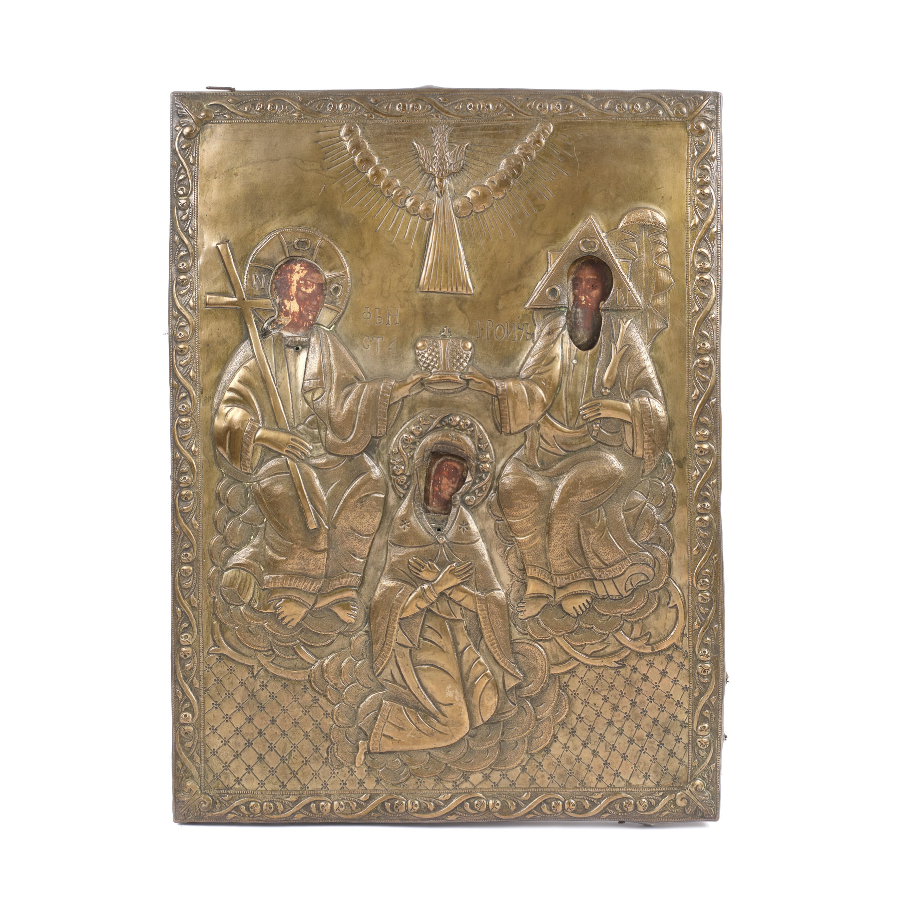 54. Icoană pe lemn, cu ferecătură, "Sfânta Treime și Încoronarea Maicii Domnului", școală românească, sec. XIX, provine din colecţia Lucrezia și Ion Pacea
