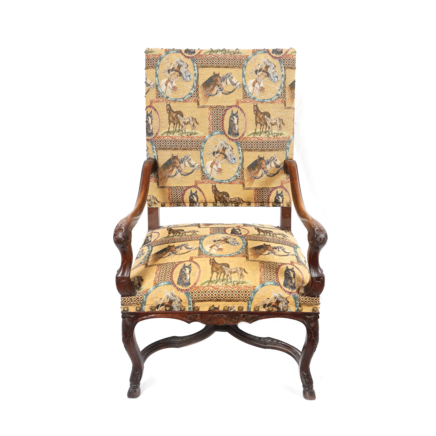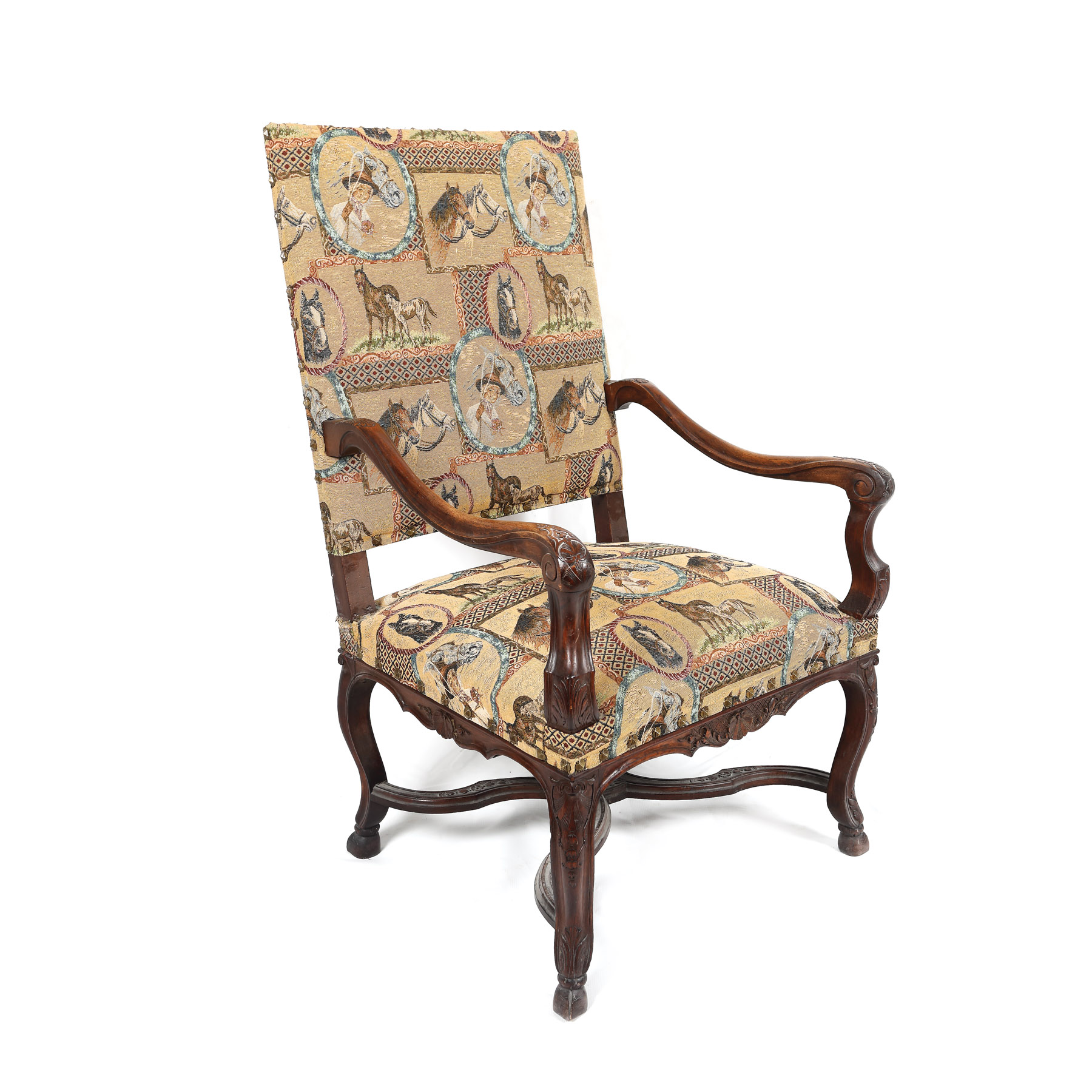 141. Jilț cu cadru de inspirație Renascentistă și tapiserie cu decor hipic, sfârșitul sec. XIX, provine din colecţia Lucrezia și Ion Pacea