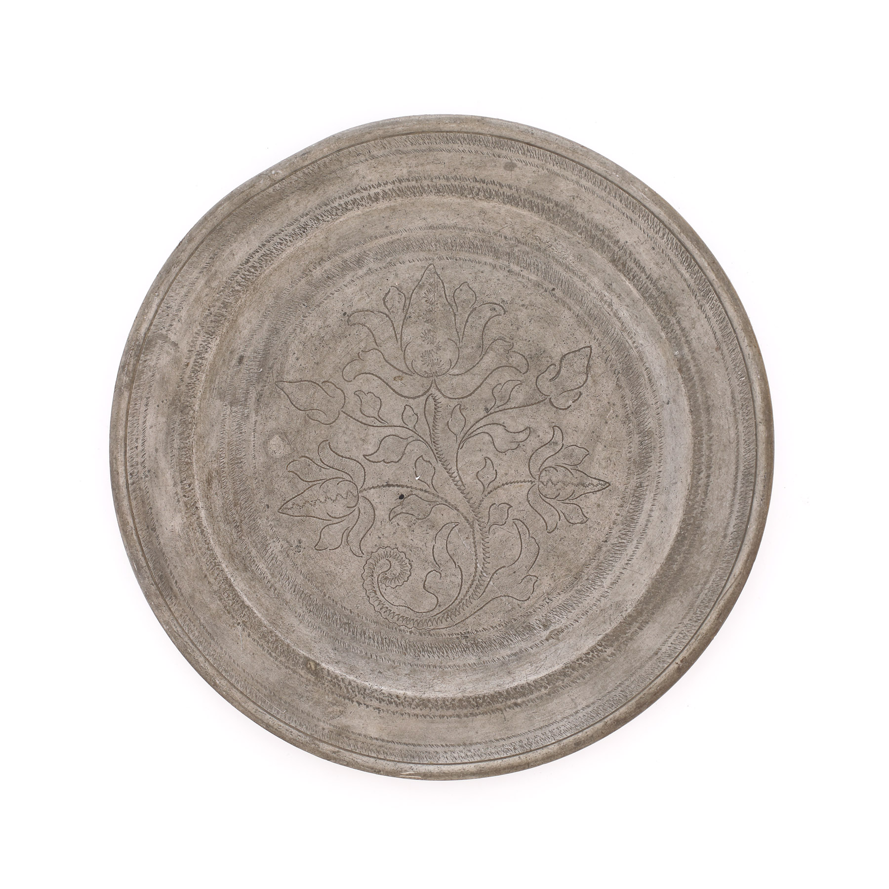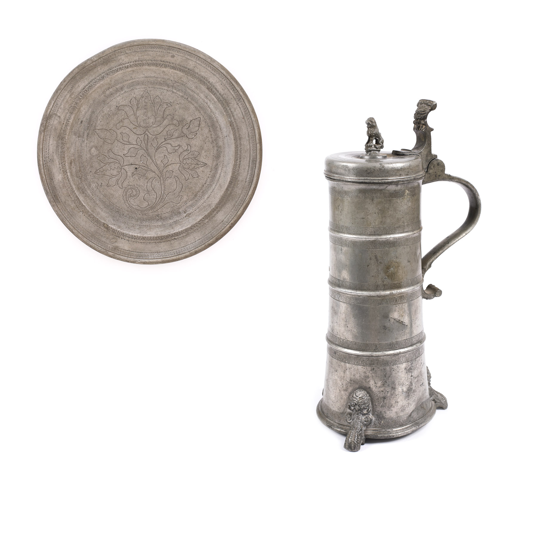 86. Lot din cositor, format din farfurie gravată, Sibiu, a doua jumătate a sec. XVIII și carafă, Sighișoara, sec. XVII, provine din colecţia Lucrezia și Ion Pacea