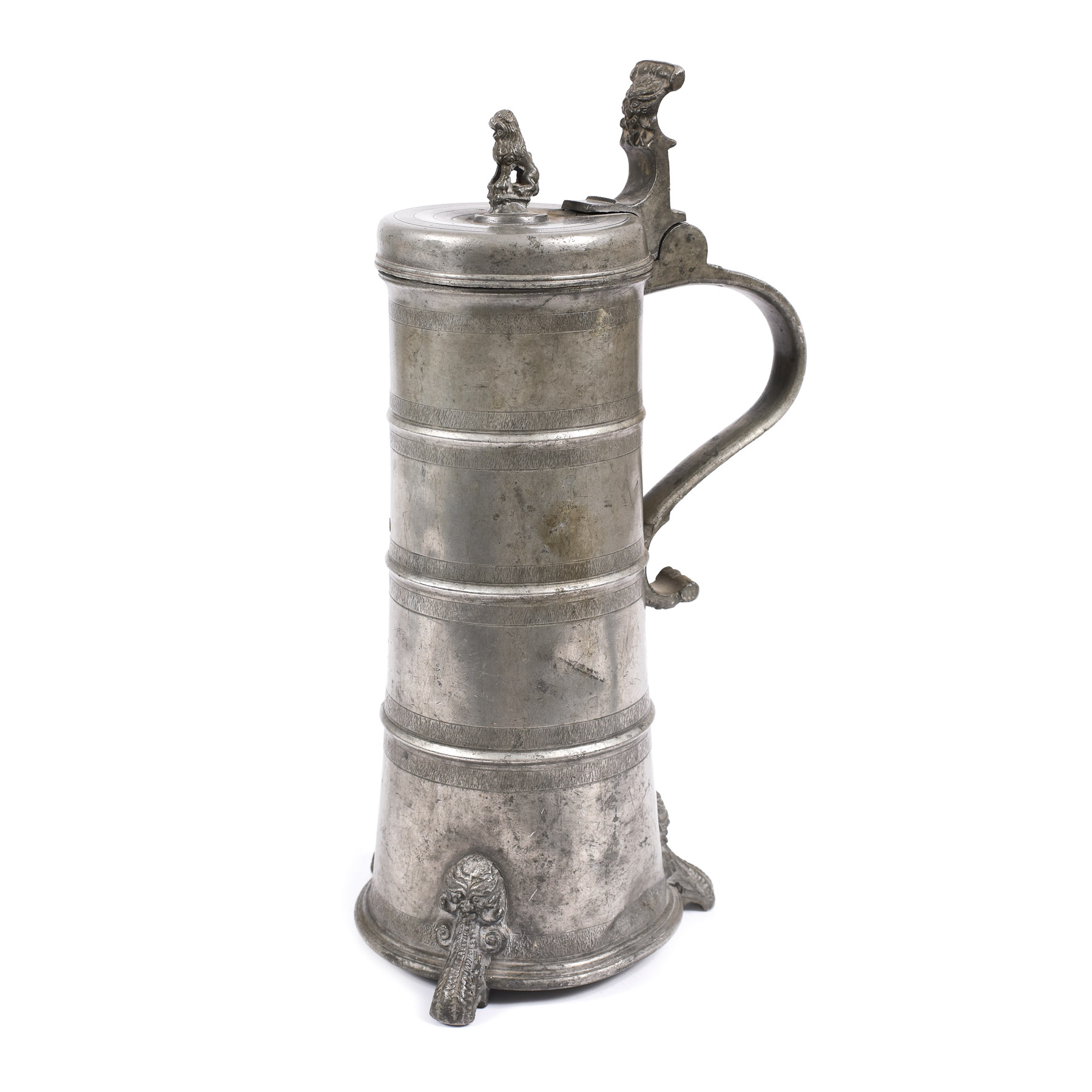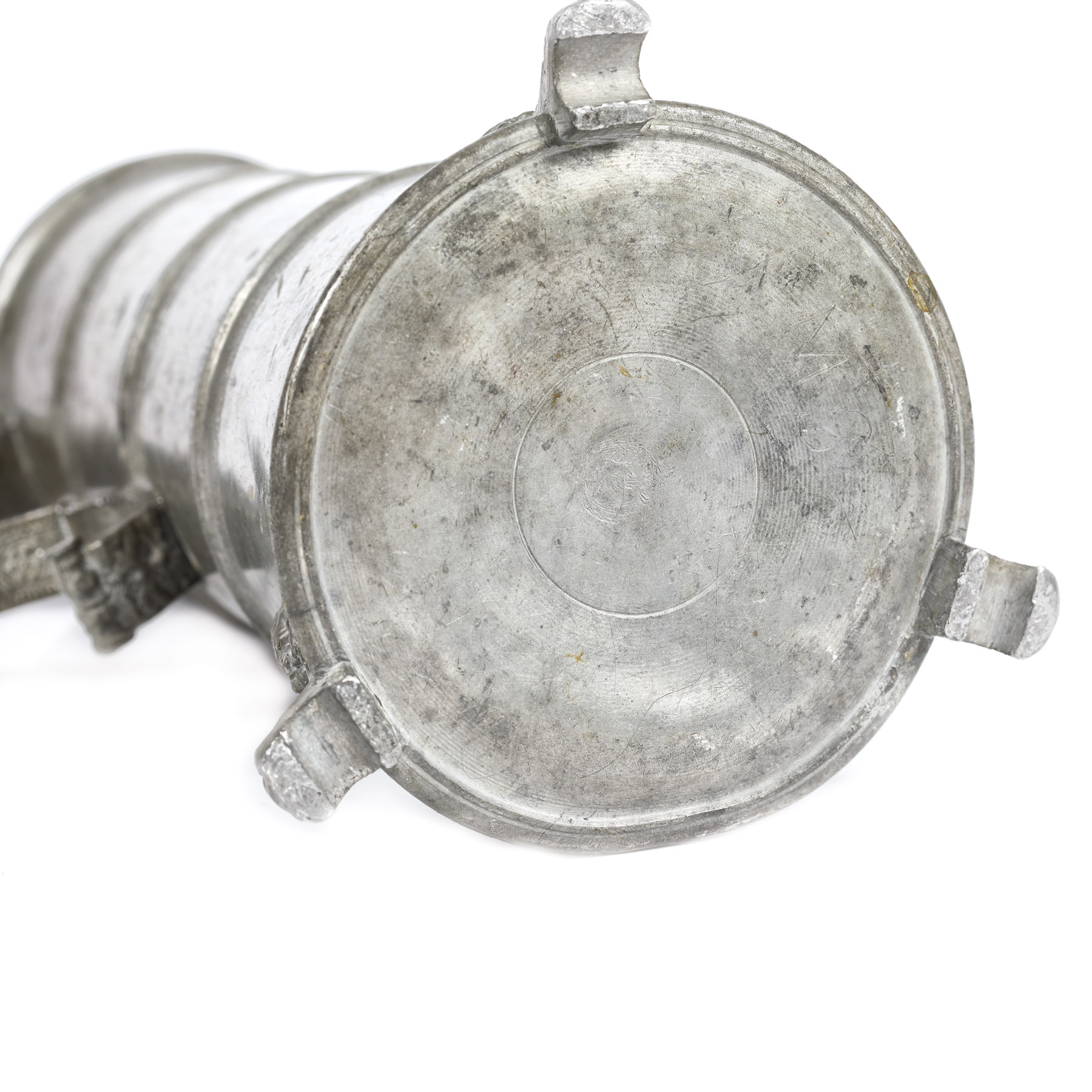 Cană cilindrică de transport, decorată cu trei brâuri profilate și brâuri incizate. Trei picioare de forma unor ciucuri, decorate cu mascaroni. Dispozitivul de deschidere decorat cu un mascaron asemănător. Ansă în "S", cu decor floral specific transilvănean. Pe capac, în partea interioară, profilul unui soldat roman. Farfurie marcată pe partea posterioară (meșter DS), cu decor gravat și ștanțat cu o floare de lalea, iar pe margini, cercuri incizate, striate.