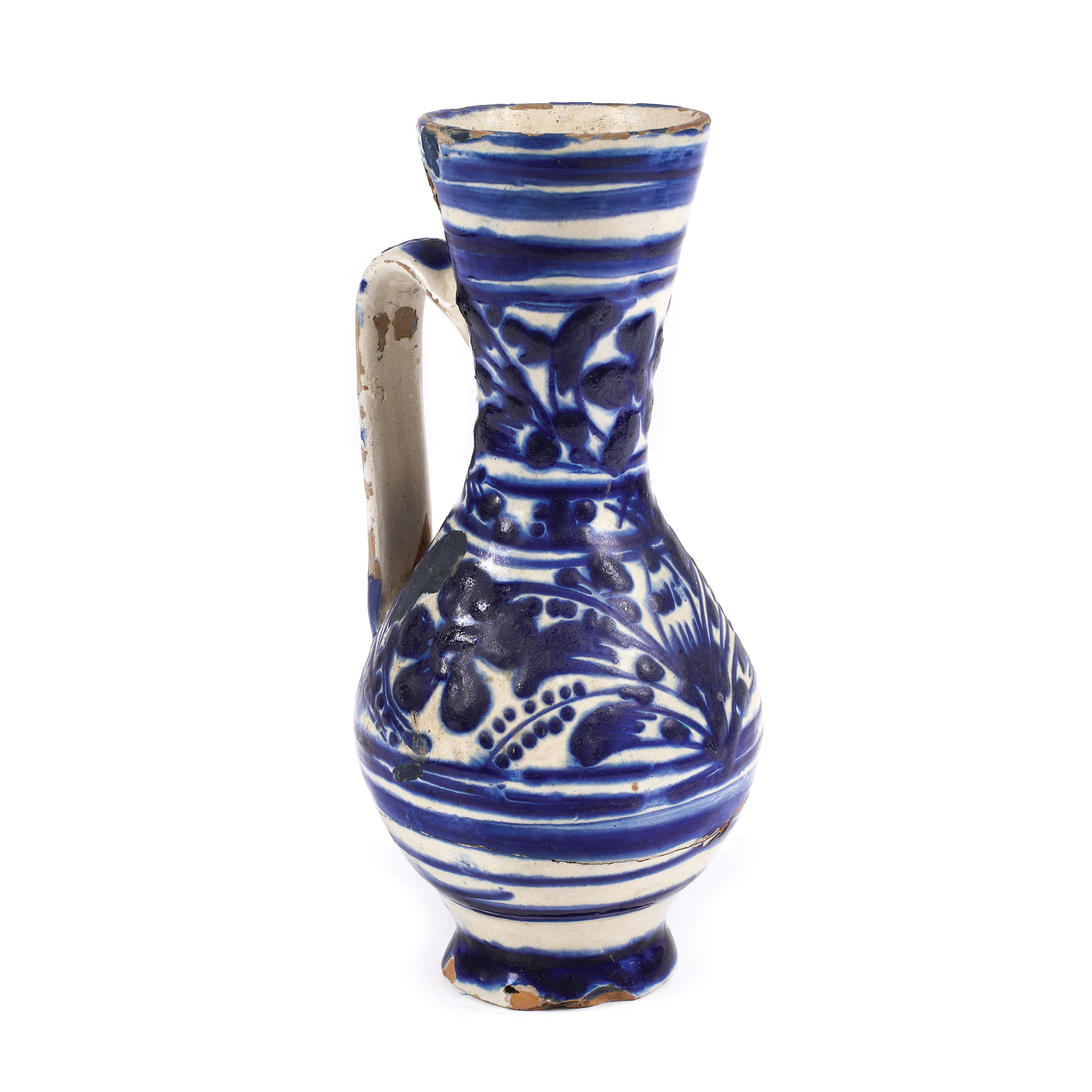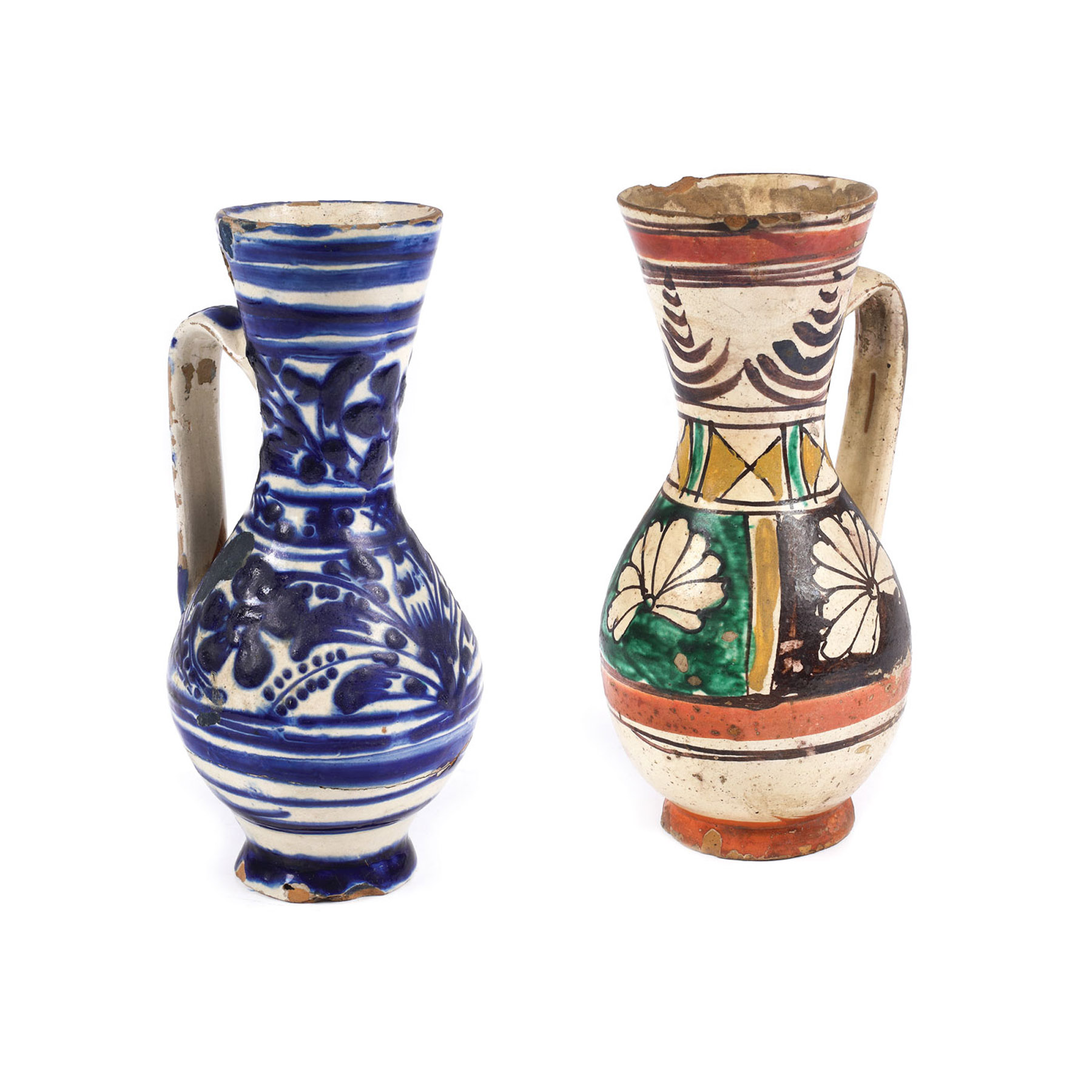 A. Formă piriformă, prevăzută cu toartă și gură evazată. Decorul este dispus la exterior în trei registre, separate prin grupaje de cercuri, iar motivul central este vegetal și este dispus în trei casete. Cromatica: verde, brun, galben, cărămiziu pe fond alb. Starea de conservare este satisfăcătoare (gura vasului prezintă multe ciobituri). B. Forma este piriformă, prevăzută cu toartă și gură evazată. Decorul este dispus la exterior, în trei registre de motive vegetal-florale separate prin grupaje de linii. Cromatica: albastru cobalt pe fond alb angobat. Starea de conservare este satisfăcătoare (prezintă nenumărate desprinderi ale smalțului și o ciobitură la bază).