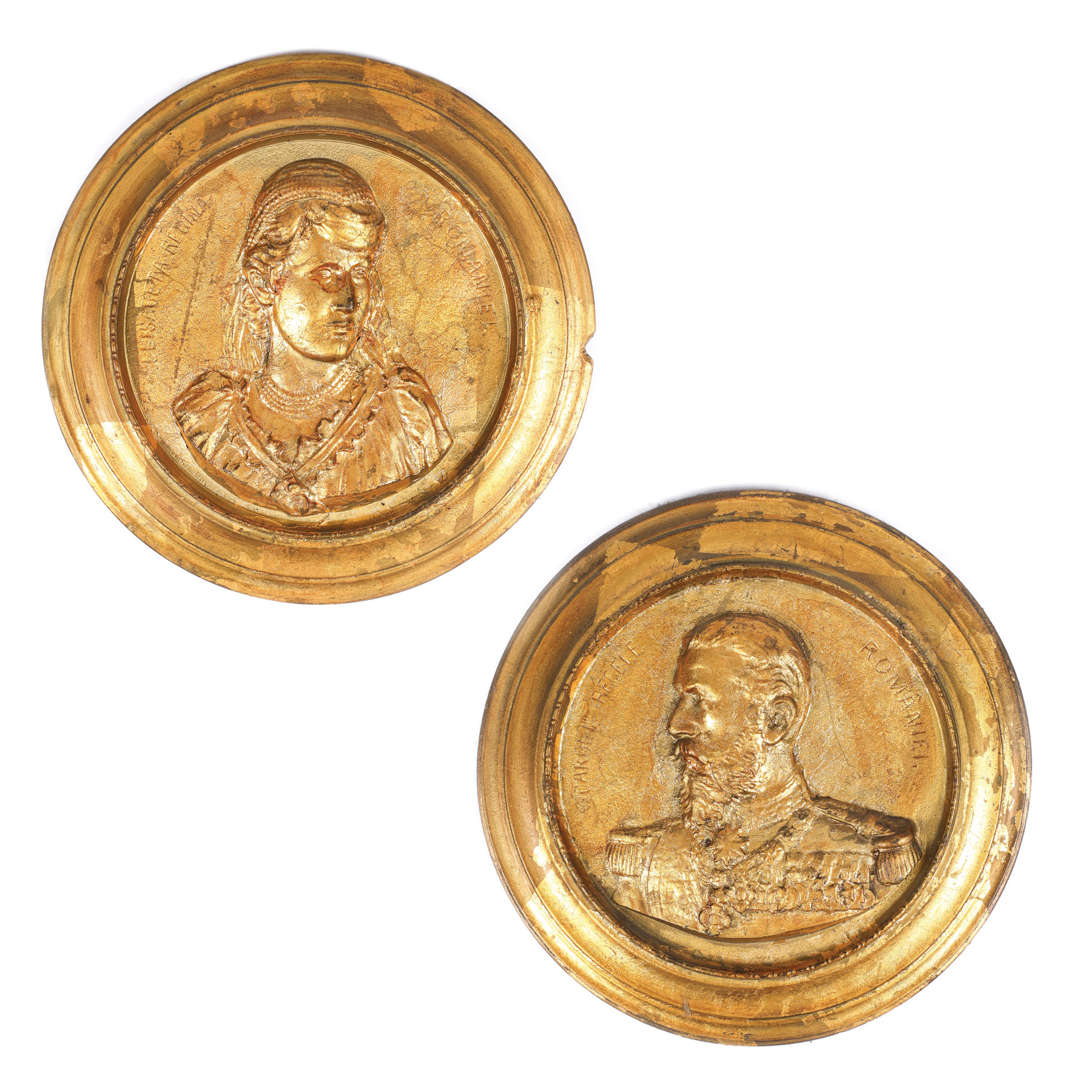 115. Lot format din două plachete din bronz aurit, reprezentându-i pe Regele Carol I și pe Regina Elisabeta, provine din colecţia Lucrezia și Ion Pacea
