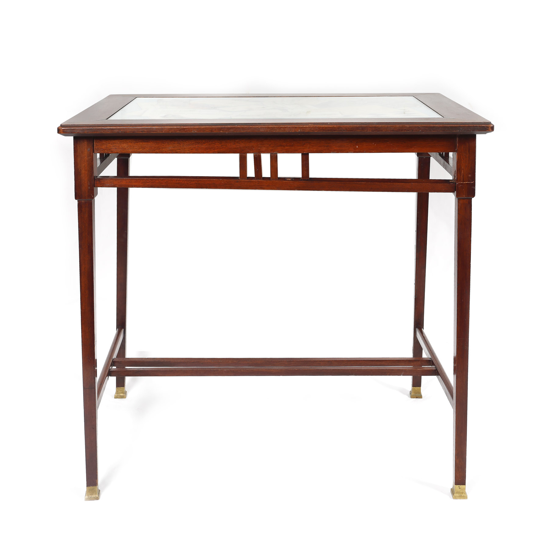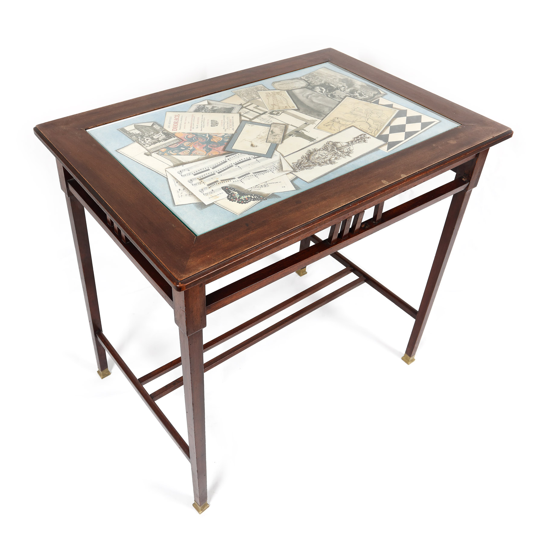 142. Masă de lucru de inspirație Directoire, cu blat decorat cu ilustrații, începutul sec. XX, provine din colecția Lucrezia și Ion Pacea