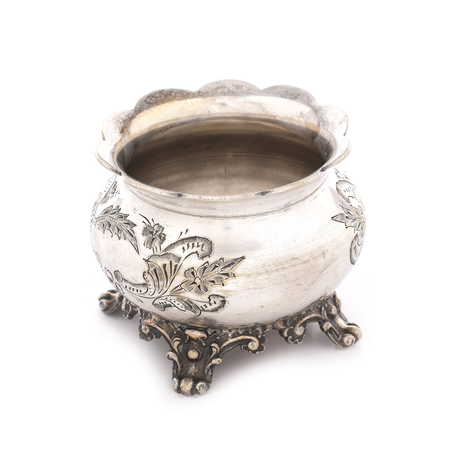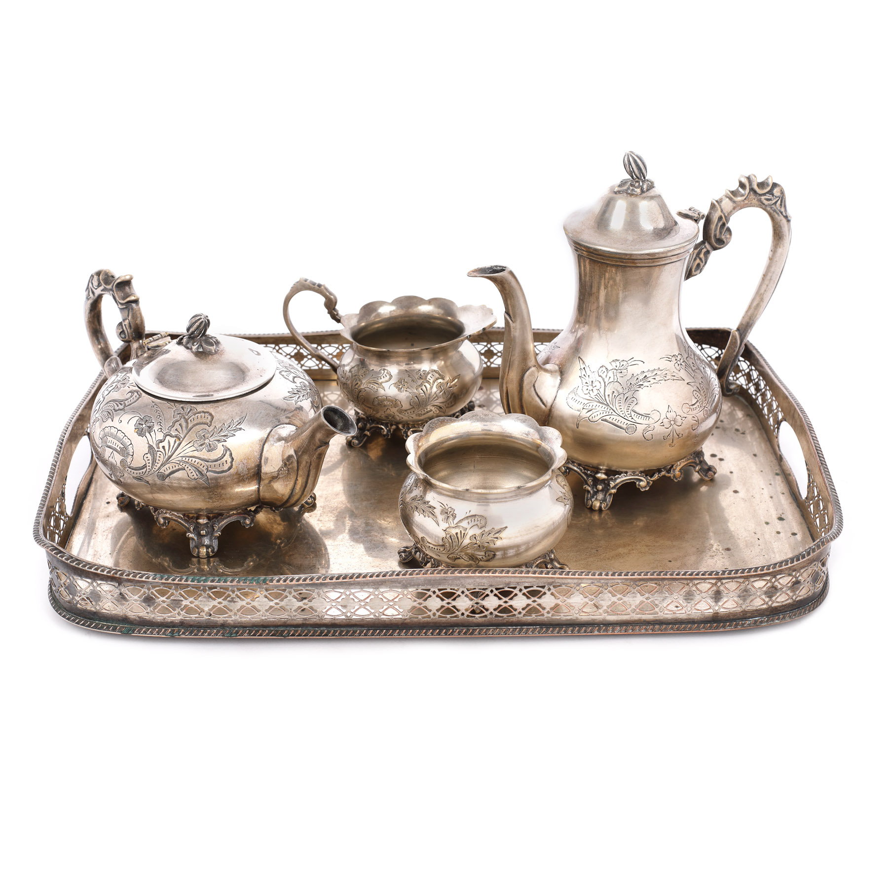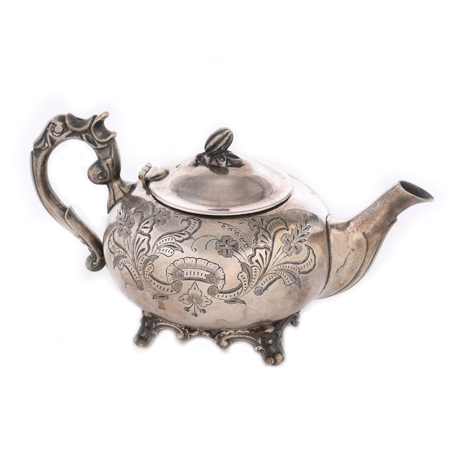 133. Serviciu Victorian pentru ceai, format din tavă, ceainic, cafetieră, letieră și zaharniță, provine din colecţia Lucrezia și Ion Pacea