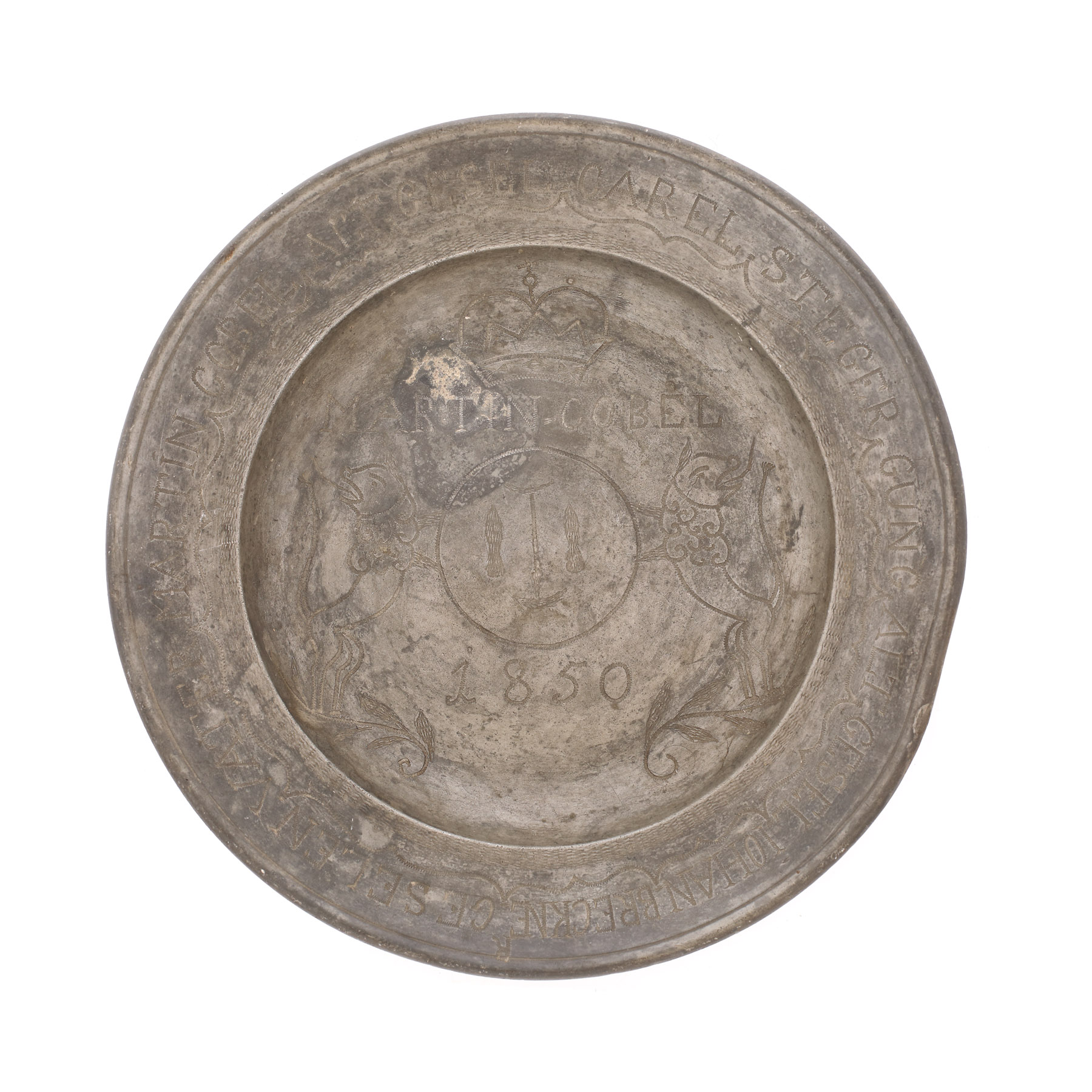 85. Taler pentru nuntă, din cositor, dăruit probabil unui membru al breslei pantofarilor, 1850, provine din colecţia Lucrezia și Ion Pacea