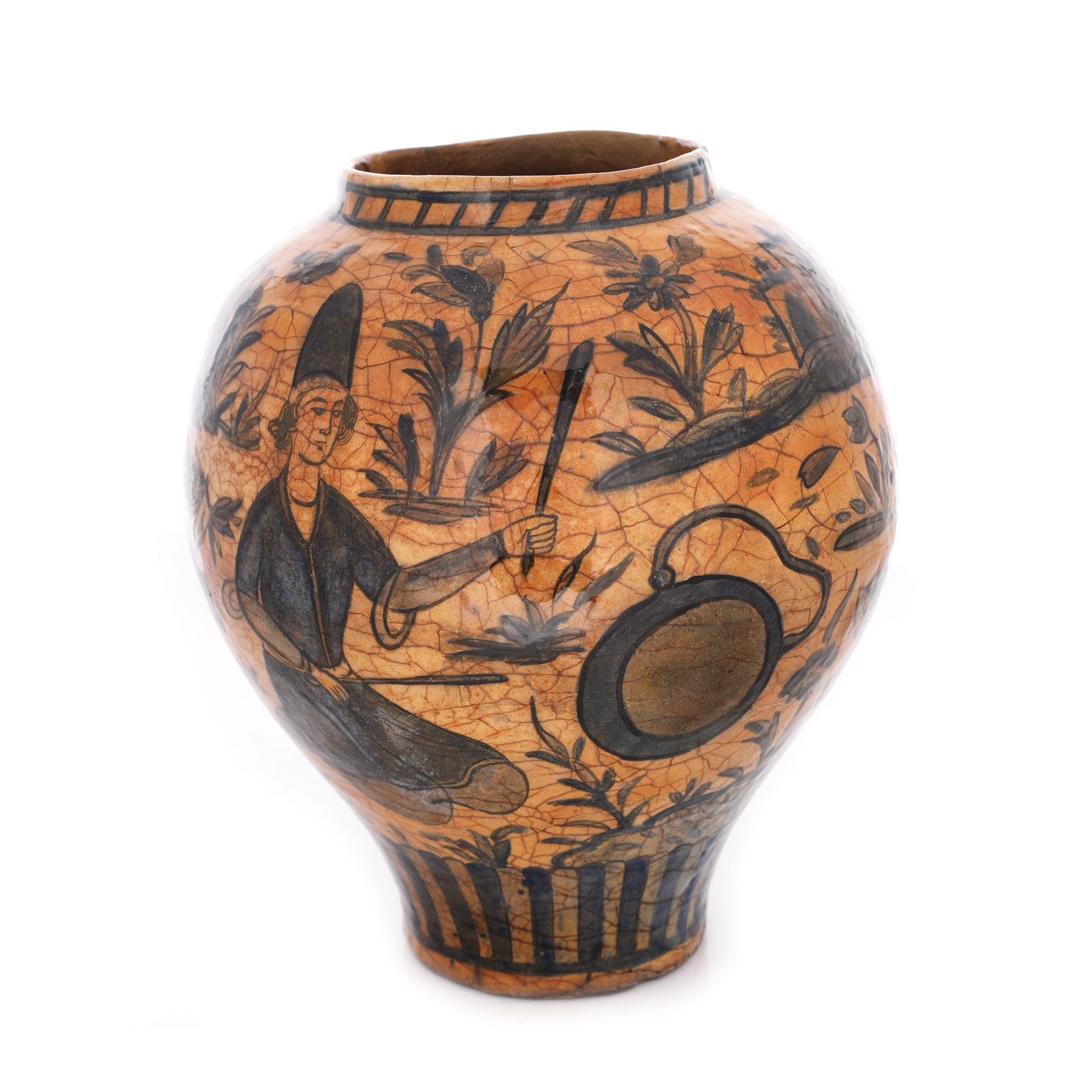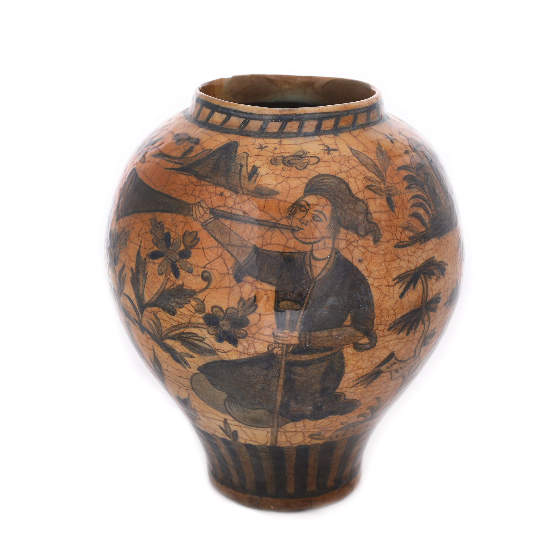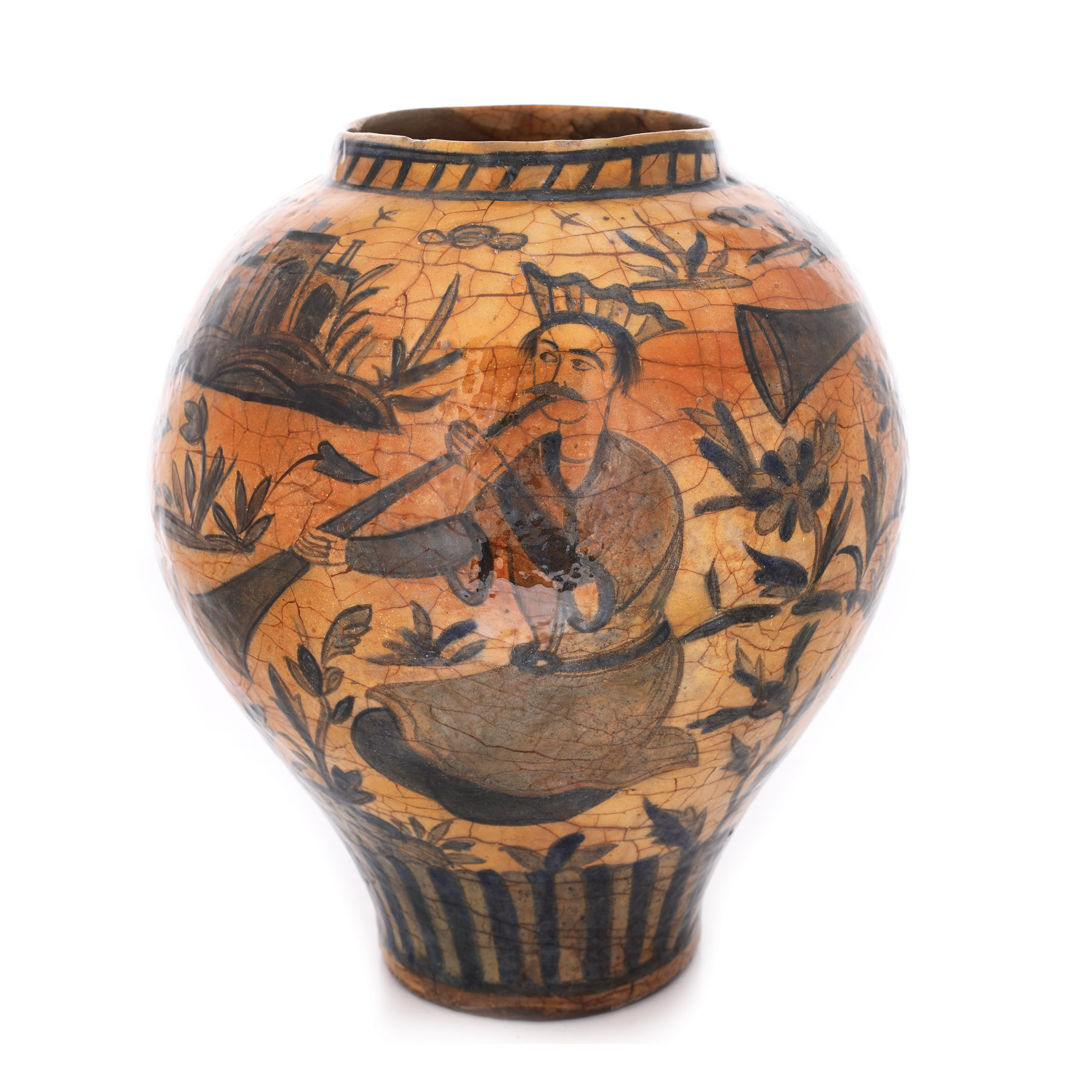 96. Vas persan din ceramică smălțuită, decorat cu derviși, perioada dinastiei Qajar, sec. XIX, piesă rară, provine din colecţia Lucrezia și Ion Pacea