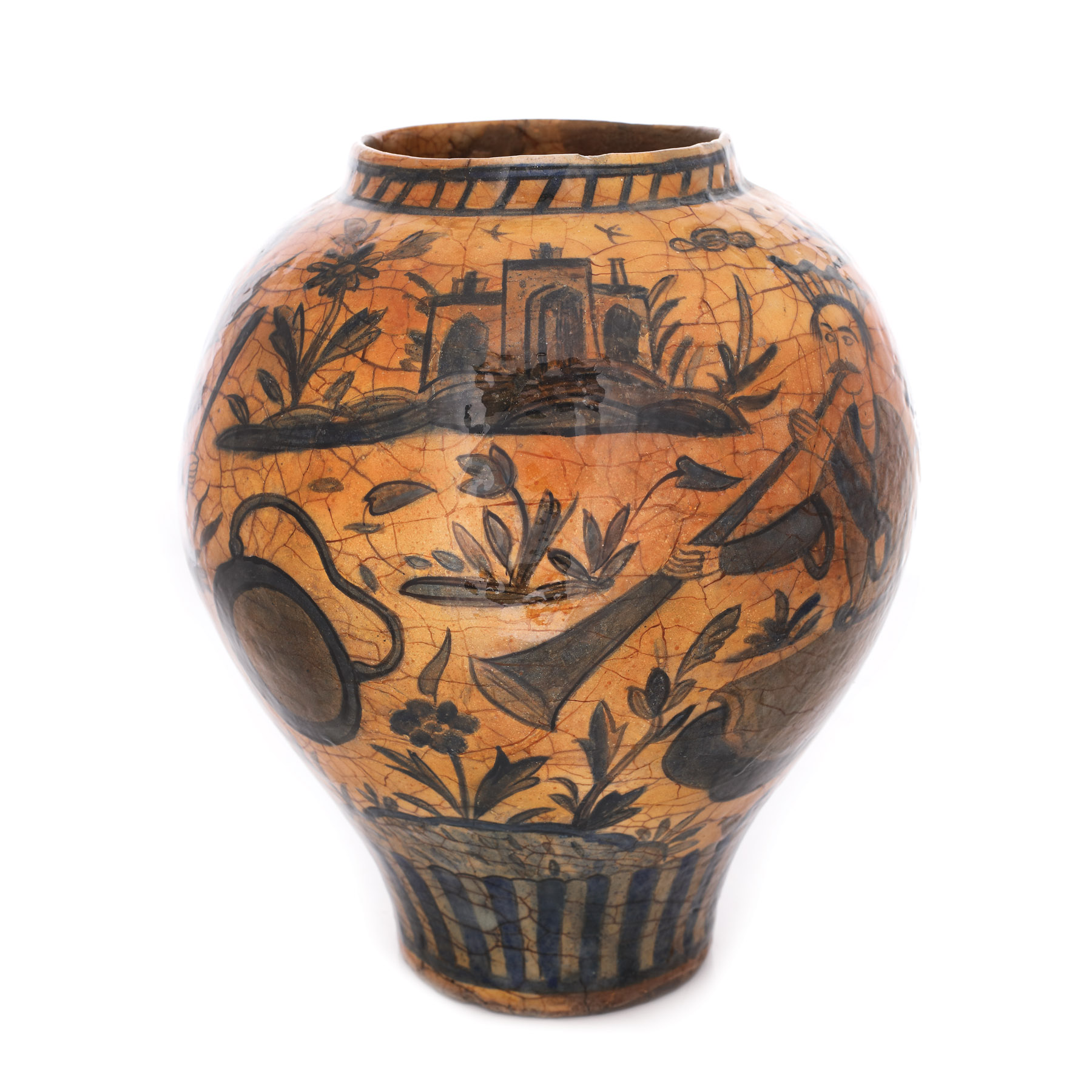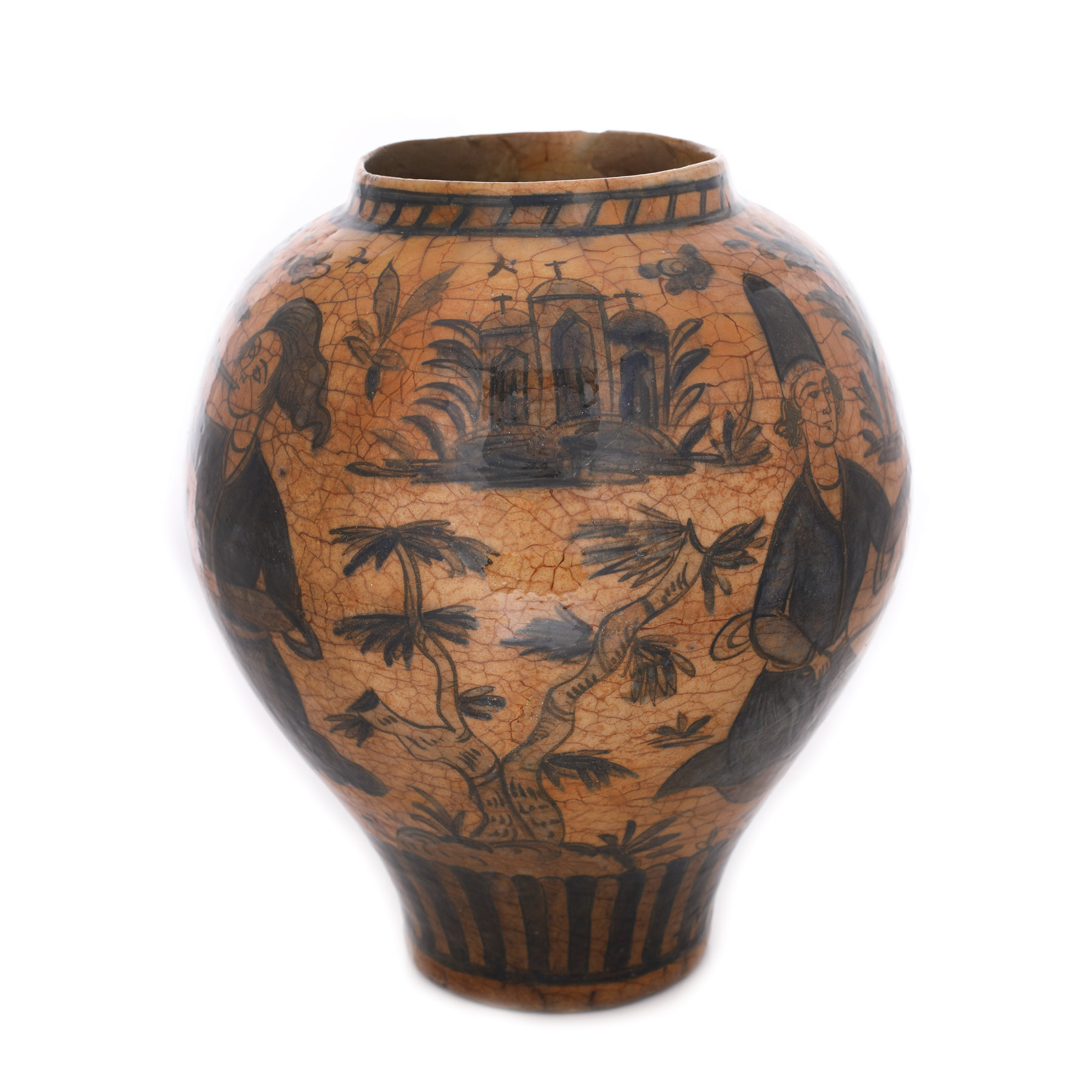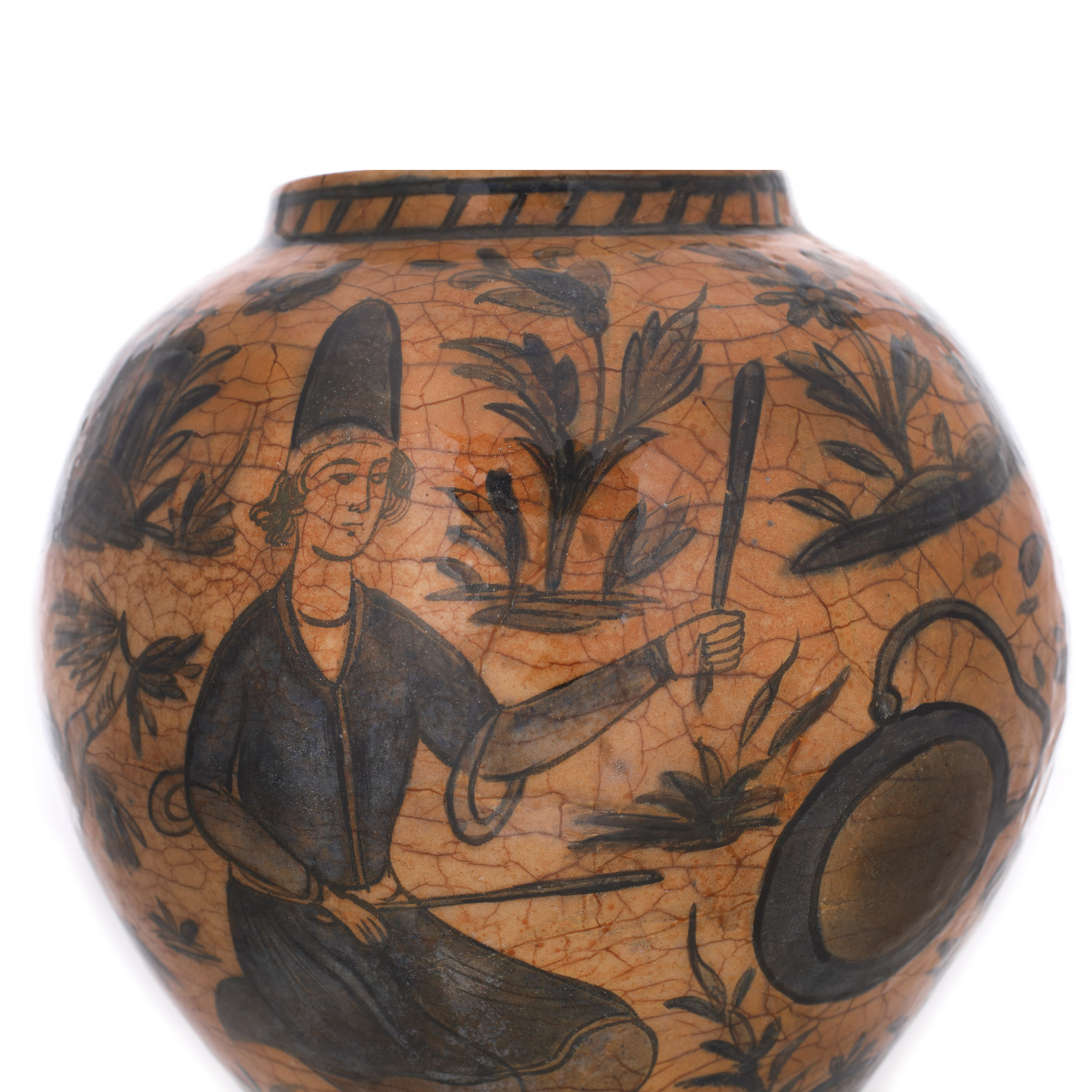96. Vas persan din ceramică smălțuită, decorat cu derviși, perioada dinastiei Qajar, sec. XIX, piesă rară, provine din colecţia Lucrezia și Ion Pacea