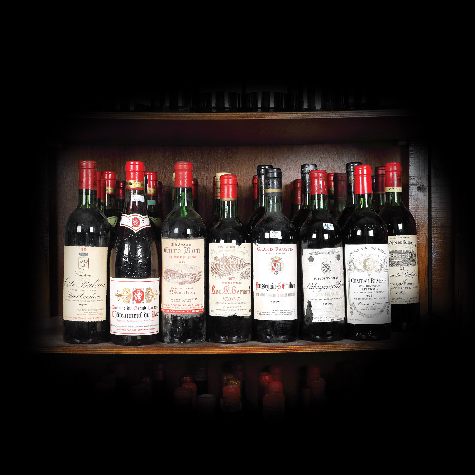 Château Dauzan, Saint Émilion, 1970, 5st x 0,7l Château Côte de Baleau, Grand Cru Classé, Saint Émilion, 1970, 1st x 0,7l Écharpe Rouge, Bordeaux, 1970, 1st x 0,7l Domaine du Grand Condorcet, Châteauneuf-du-Pape, 1972, 4st x 0,7l Clos de L'Eglise, Bordeaux, 1973, 2st x 0,7l Château Curé Bon La Madeleine, Saint Émilion, 1973, 1st x 0,7l Château Roc Saint Bernard, Fronsac, 1975, 5st x 0,7l Grand Faustin Puisseguin, Saint Émilion, 1975, 2st x 0,7l Château Haut Bergey, Léognan, 1975, 1st x 0,7 l Grand Faustin Puisseguin, Saint Émilion, 1976, 2st x 0,7l Château Carluc, Baronne de Montfort,Saint Émilion, 1976, 1st x 0,7l Château Labergoce Zede, Margaux, 1976, 1st x 0,7l Château la Bos, Bordeaux, 1979, 1st x 0,7l Château Reverdi, Listrac, Médoc, 1981, 2st x 0,75l Les Châteaux Sancerre, 1982, 1st x 0,7l Château Rahoul, Graves, 1982, 2st x 0,75l Château Reverdi, Listrac, Médoc, 1982, 3st x 0,75l Château du Bousquet, Côtes de Bourg, Gironde, 1982, 1st x 0,75l Château Lieujean, Haut Médoc, 1986, 1st x 0,75l Château Lartigue de Brochon, Haut Médoc, 1988, 1st x 75l