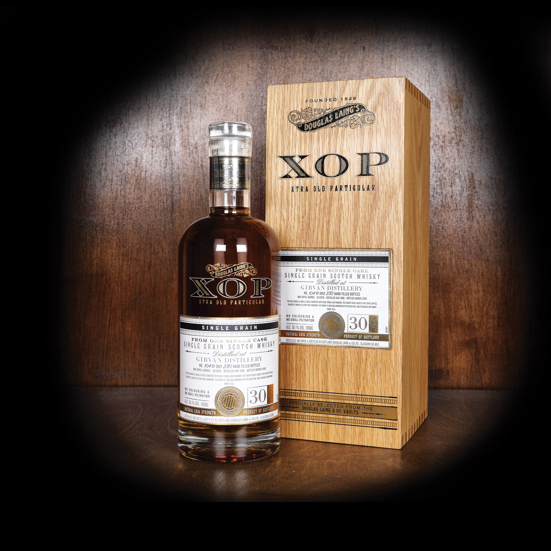 Distilat în iulie 1988 la Girvan, acest whisky scoțian single grain a fost maturat într-un singur hogshead care a produs 230 de sticle. După 30 de ani, acest lichid special a fost îmbuteliat la 58,1% ABV în martie 2019, pentru seria Xtra Old Particular a lui Douglas Laing. Foarte special și într-adevăr foarte vechi.
