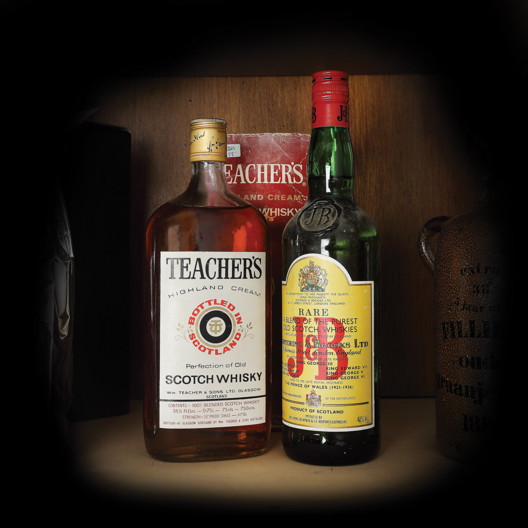 J&B Scotch Whisky, 1 st x 0,7l Teachers Highland Cream, 1st x 0,75l etichetă produsă in anii 1970, primul whisky fiind creat de William Teacher in anul 1832.