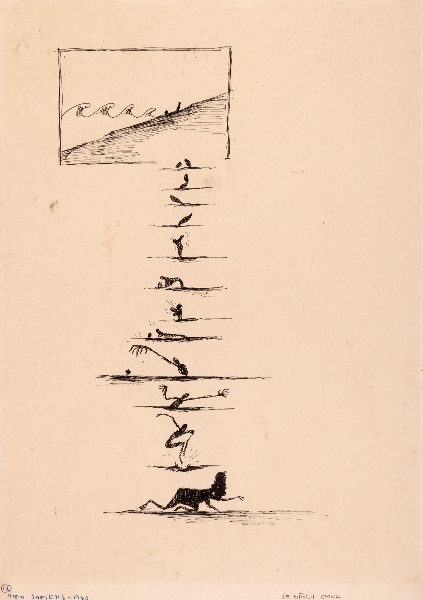 notat, numerotat și intitulat stânga jos, cu negru, ””Homo sapiens, 1960, 12”; notat dreapta jos, cu negru, ”S-a născut omul”