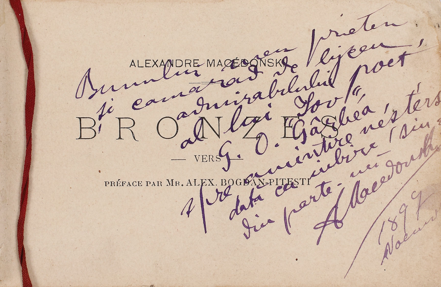 97. "Bronzes”, de Alexandru Macedonski, Paris, 1897, cu dedicația și semnătura olografă a autorului către poetul G.O. Gârbea