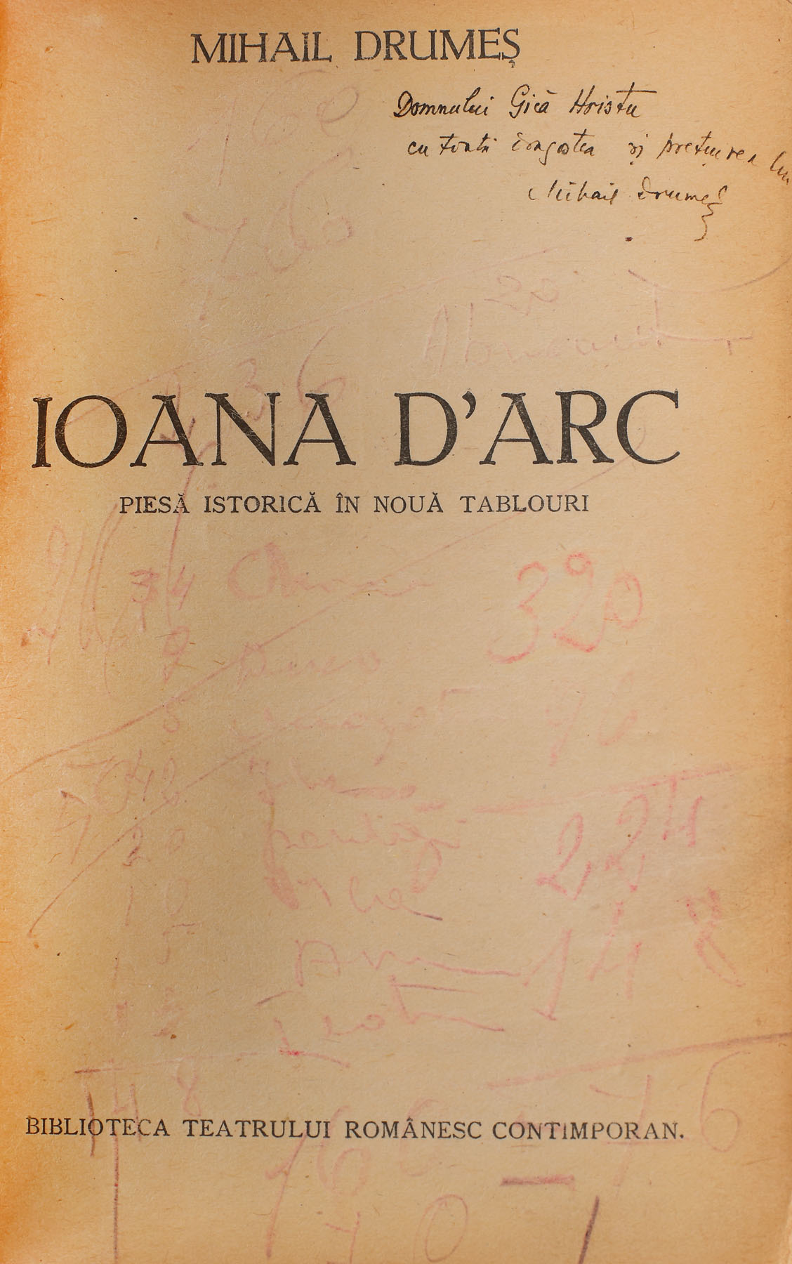 106. Colegat ”Ioana D`Arc”, ”Năluca”, ”O crimă pasională” și ”Trei comedii”, de Mihail Drumeș, București, cu dedicația și semnătura olografă a autorului