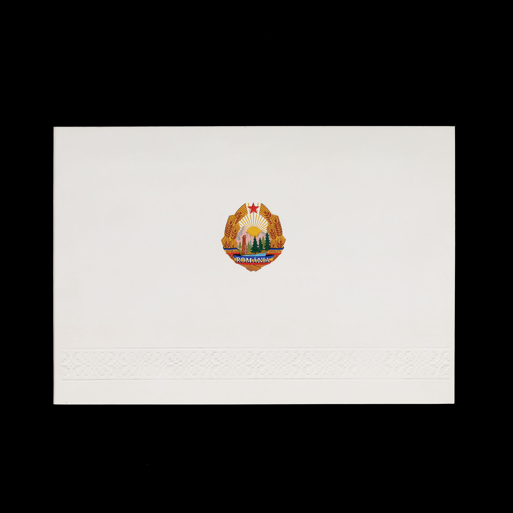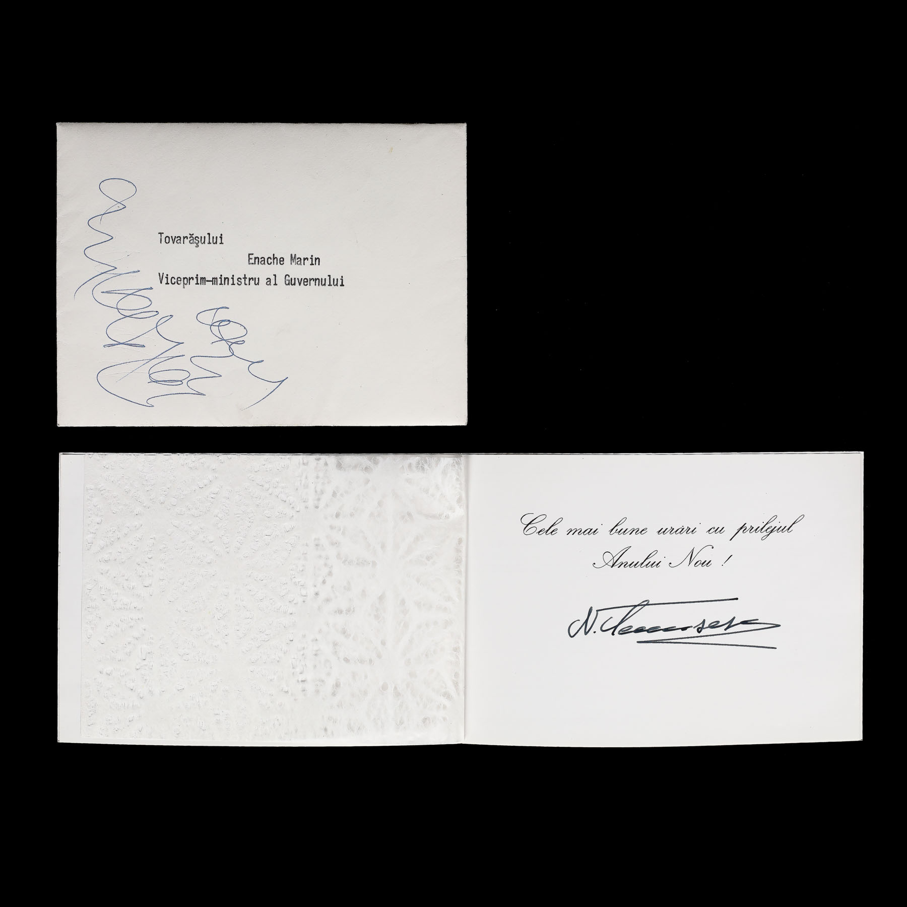 58. Felicitare cu ocazia Anului Nou, trimisă de Nicolae Ceaușescu viceprim-ministrului Guvernului, Marin Enache, cu semnătura olografă a lui Nicolae Ceaușescu, în plic original, cca. 1984