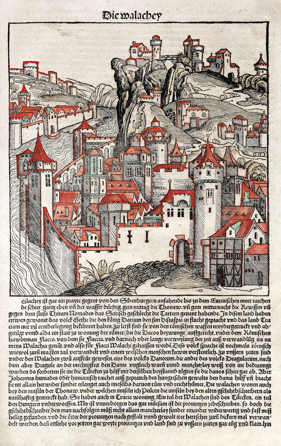 Hartmann Schedel a fost un medic și scriitor de seamă, care a reunit una dintre cele mai mari colecții private de cărți din secolul al XV-lea. Lucrarea lui Schedel este ilustrată cu peste 1800 de xilogravuri semnate de Michael Wohlgemut (1434-1519) și de fiul său, Wilhelm Pleydenwurff (1460-1494). Wohlgemut, un important pictor și gravor, este cunoscut pentru faptul că a fost un profesor timpuriu al lui Albrecht Dürer, care a fost ucenic în atelierul lui Wohlgemut din 1486 până în 1489. Se crede că Dürer a fost implicat în producerea mai multor ilustrații din Liberul lui Schedel Chronicarum, deoarece lucrările pentru ilustrații au început în perioada în care Dürer era ucenic. Un studiu al mai multor ilustrații sugerează că ar fi putut fi desenate de Dürer, care ar fi pregătit desenele folosite ca forme pentru meșterii care tăiau plăcile pentru gravură. Gravura nu reprezintă unul dintre burgurile aflate în Transilvania, probabil este o imagina preluată din zona germană, colorată mai tarziu. Hârtie originală cu filigran, reprezentând o cruce, pe mijlocul paginii. Textul prezintă o istorie a teritoriului intracarpatic, respectiv Transilvania. Sunt amintiți dacii, expediția lui Darius la nordul Dunării și războaiele cu turcii. De asemenea textul amintește și de Ioan de Hunedoara care a întreprins în calitate de regent al Ungariei o serie de campanii militare reușite împotriva Imperiului Otoman, lăsând fiului său un regat sigur și stabil. Mama lui a fost Erzsébet Szilágyi (Elisabeta), dintr-o familie de nobil maghiari cu foarte mare influență, fiica căpitanului László Szilágyi de Horogszeg (Ladislau) al cetății de la Bradics și sora lui Mihai Szilágyi, voievod transilvănean și regent ungar.