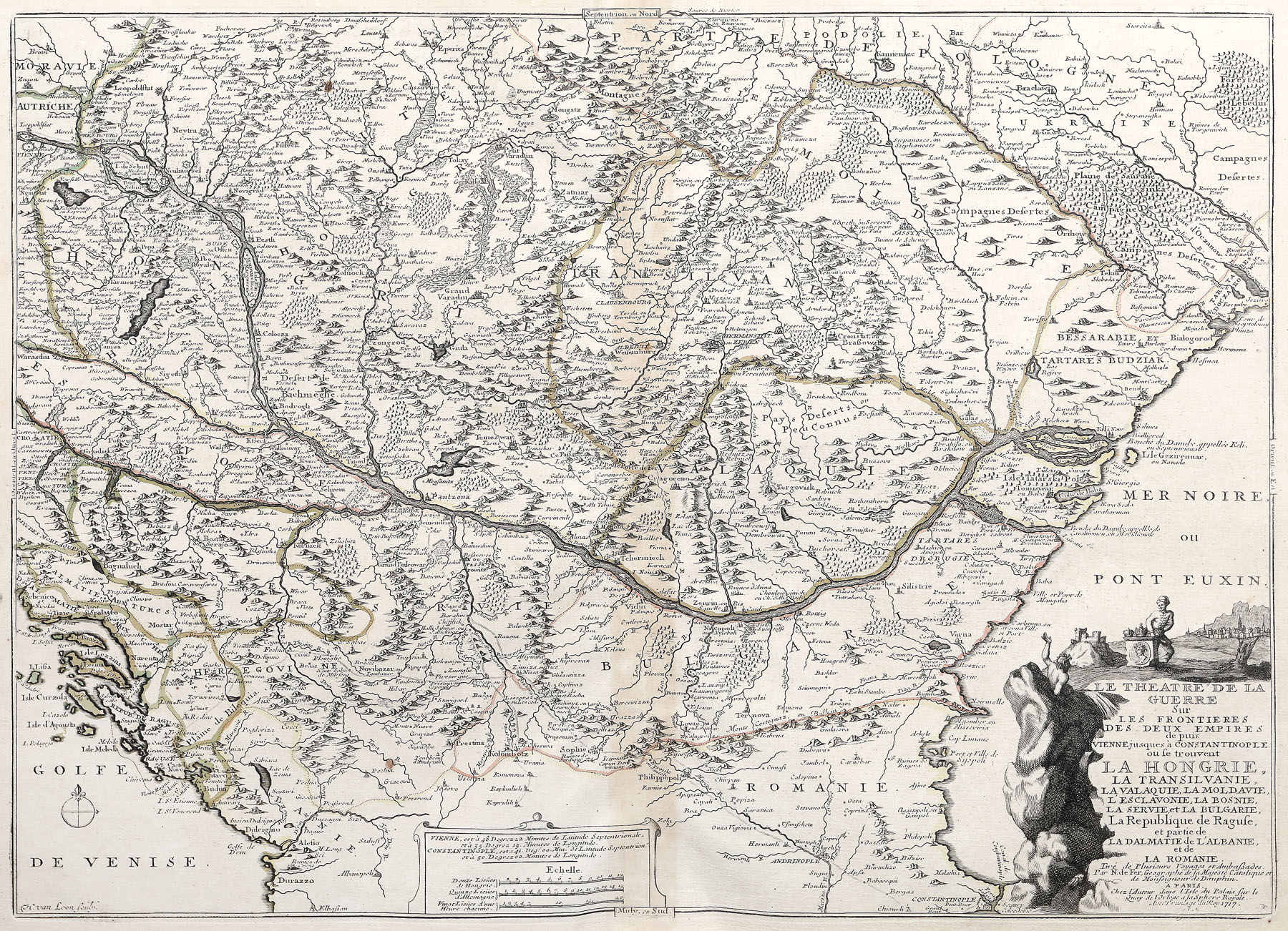70. Hartă a teatrului de război "Ungaria, Transilvania, Valahia, Moldova, Slavonia, Bosnia, Serbia, Bulgaria, Republica Ragufe și Dalmația", de Nicolas de Fer, Paris, 1737