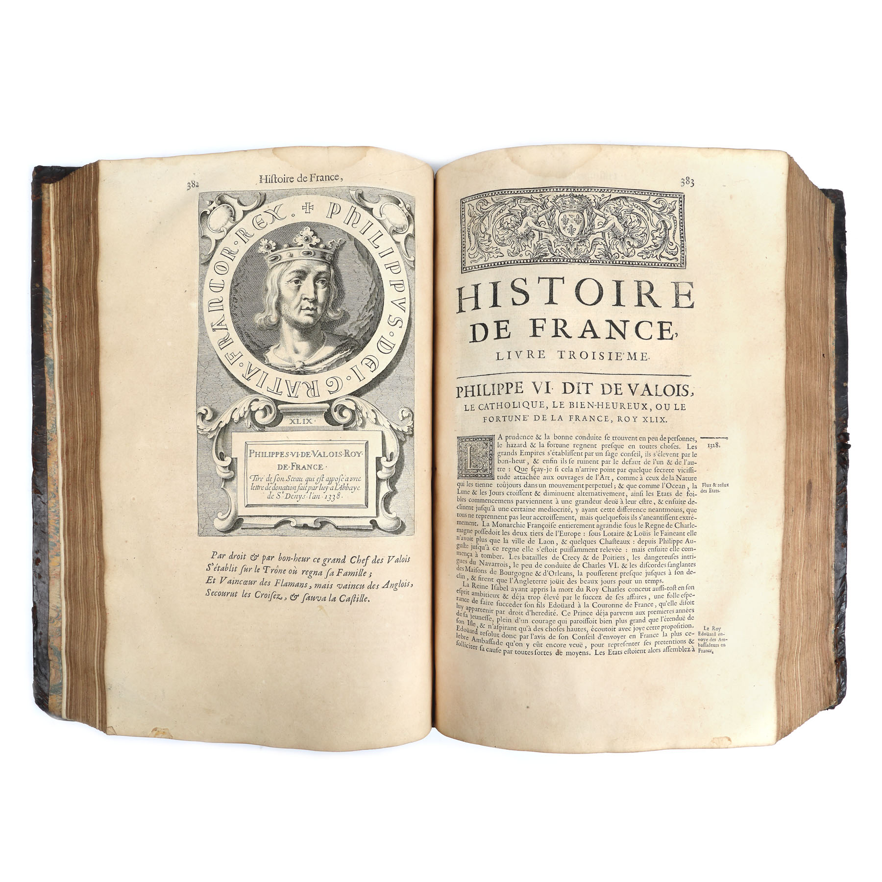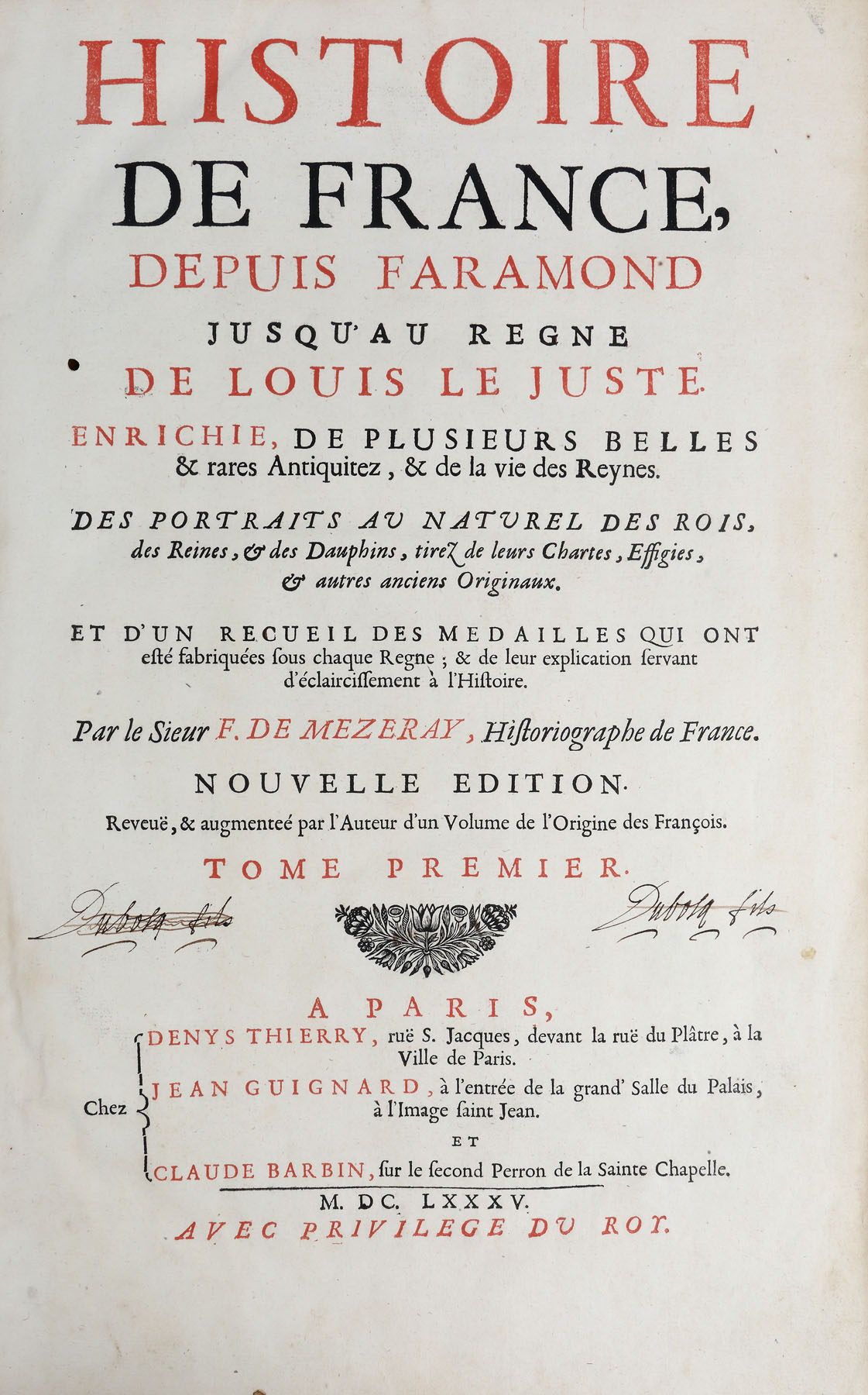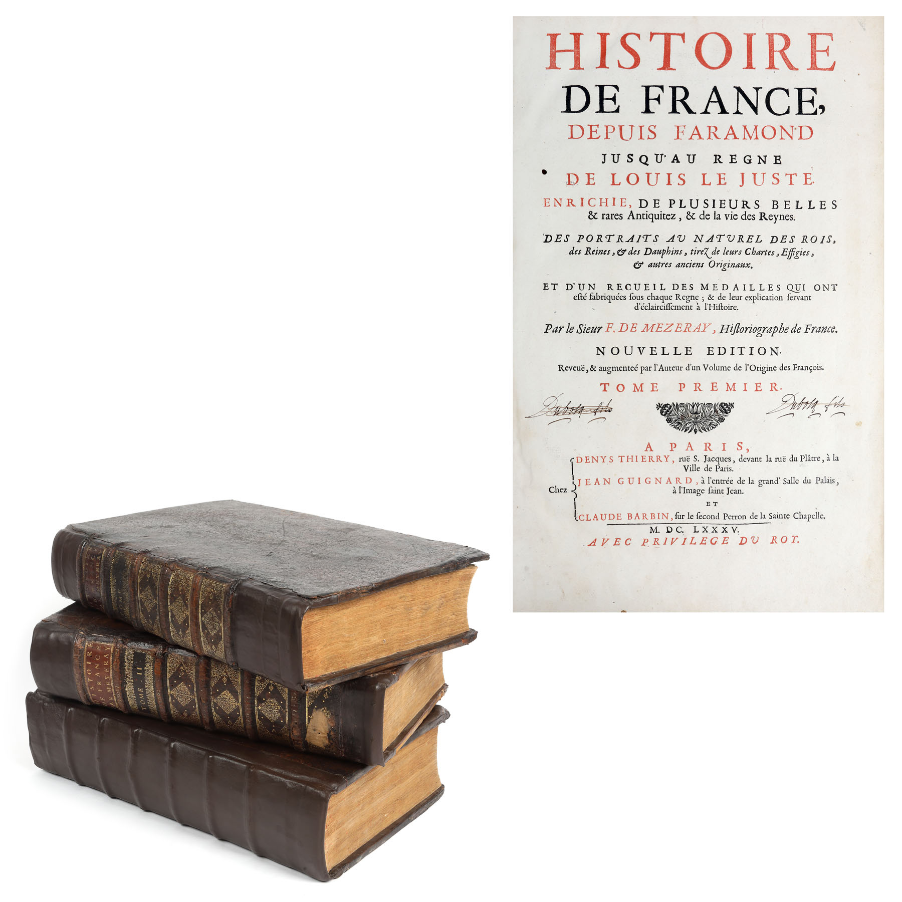 Realizată la Paris în editura condusă de ”Denies Thierry, Jean Guignard, Claude Barbin” în anul 1685. Format in-folio, volumul I zece file nenumerotate ce cuprind prefața autorului, privilegiul regal și un mesaj adresat Reginei Ana, care asigura regența Franței, 328 de pagini numerotate și alte 712 pagini privind primii regi ai Frantei; ultimile pagini cuprind tabla de materii și sunt 19 file nenumerotate. Conține numeroase gravuri reprezentând portrete ale regilor, realizate de C. Vrgnon și Rousselet și de Petrus Daret în anul 1643, la care se adaugă frontispicii, inițiale și vignete finale bogat decorate cu elemente vegetale. Legătura este din piele, pe tăblii de lemn cu restaurări artizanale, în secolul XIX. Volumul II are două file nenumerotate, 1218 pagini numerotate. Prezintă gravuri cu portrete de regi și regine. Imagini cu medalioane dedicate regilor Franței. Același tip de legătura. Volumul III are două file nenumerotate, 1386 pagini numerotate. Prezintă gravuri cu portrete de regi și regine. Legătura de carte în aceleași condiții, blocul de carte păstrându-se în condiții bune.