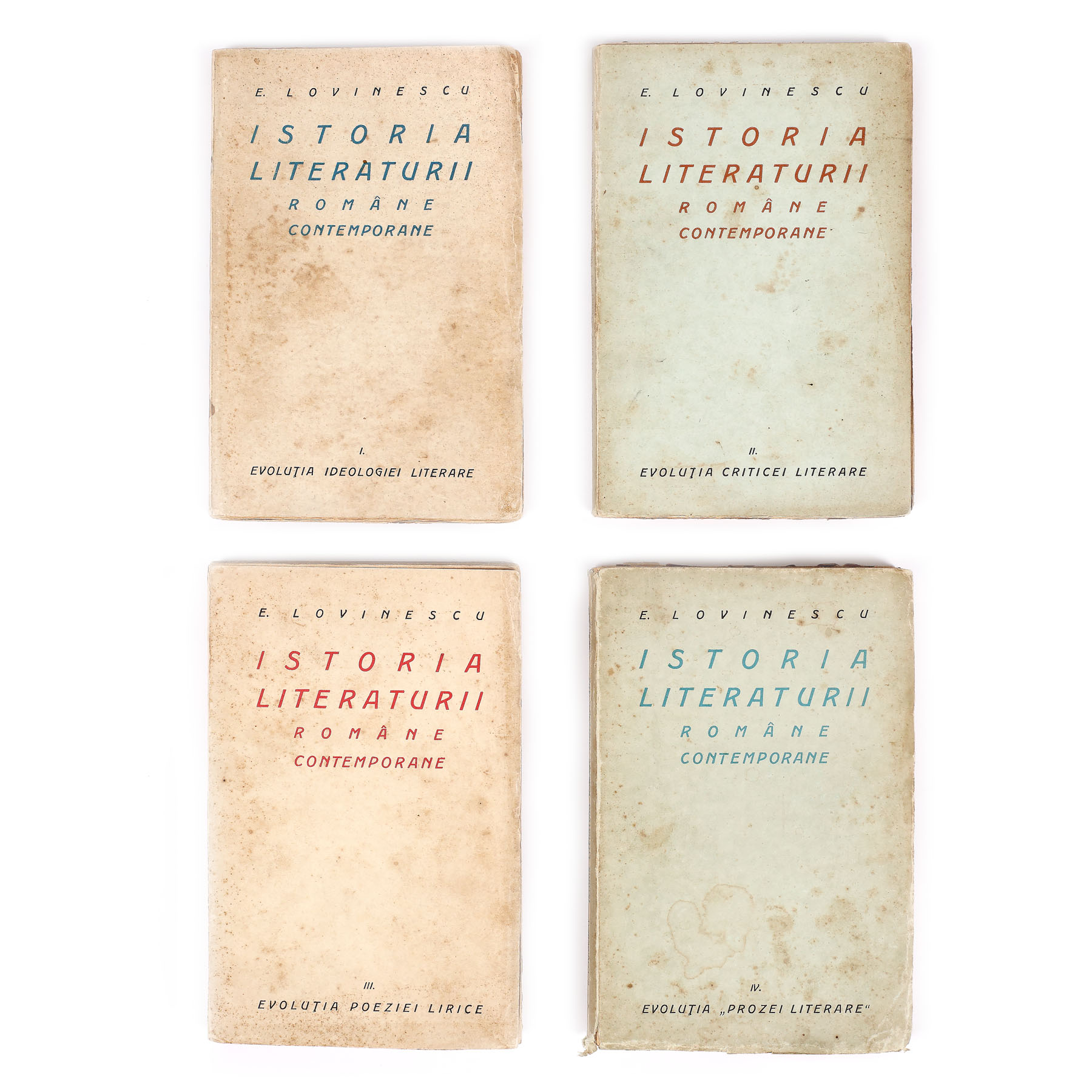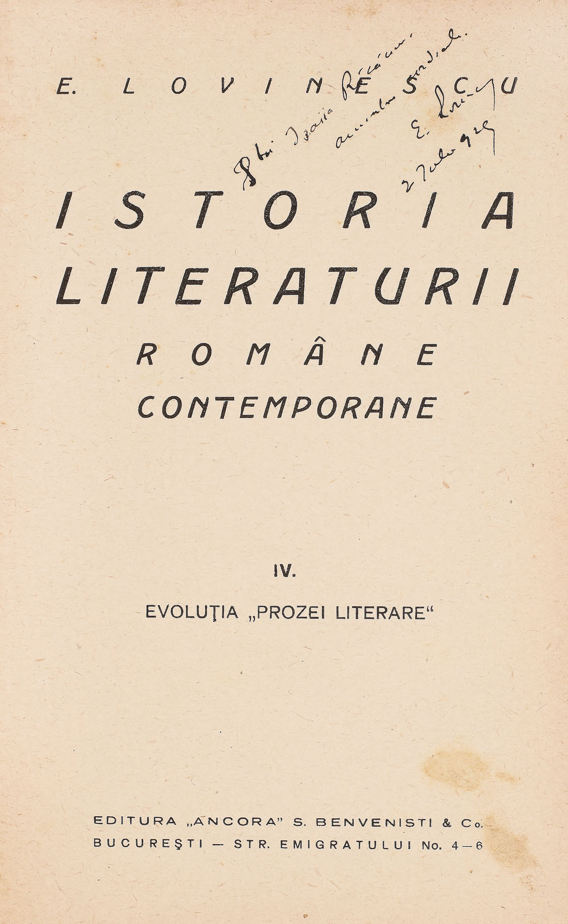96. ”Istoria literaturii române contemporane”, de Eugen Lovinescu, patru volume, București, 1926, cu dedicația olografă a autorului către scriitorul Isaiia Răcăciuni